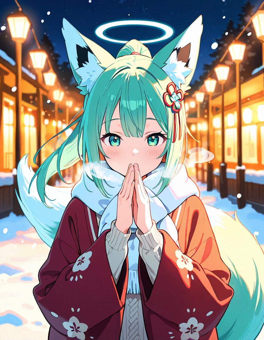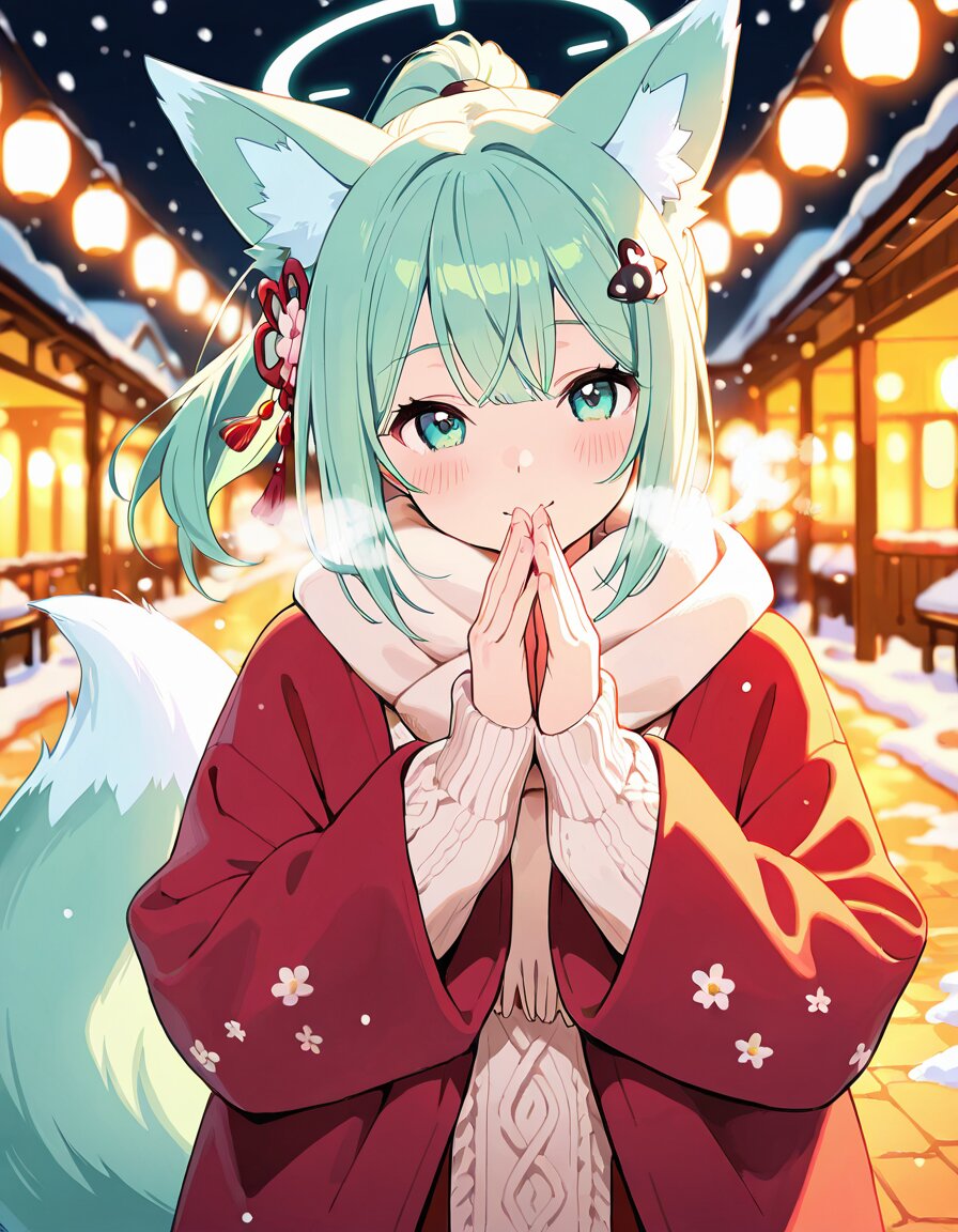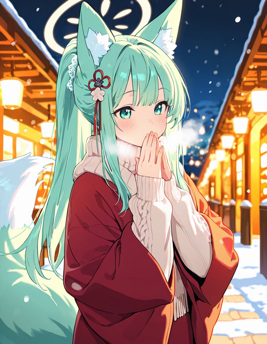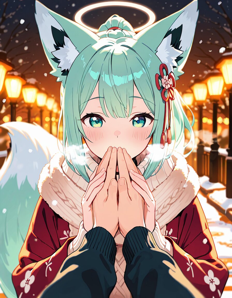 (masterpiece, best quality, detailed light, cinematic lighting, soft winter atmosphere, night scene), flat chest,(cute girl:1.2), (fluffy fox ears and a large fluffy fox tail spreading naturally behind her:1.3), (mint green hair tied in a high ponytail with a delicate kanzashi hair ornament:1.3), wearing a (fashionable knit sweater:1.4) layered over a (casual red kimono with small floral patterns), (the knit is stylish, cozy, soft-textured, with elegant modern design details), (deep navy or beige accents around the sleeves and collar), (in a snowy park at night illuminated by warm streetlights and gentle snow light:1.4), (she gently takes your hands into hers, bringing them up toward her mouth, holding them softly between her palms, breathing warm air “haa~” onto your cold fingers to warm you, her eyes meeting yours with a tender, caring expression:1.4), (warm orange glow from nearby streetlights, soft white reflection from snow, faint halo around her, visible breath in cold air, gentle snowfall, romantic winter mood, cinematic composition, shallow depth of field, focus on her expression, your hands, and her warm breath),