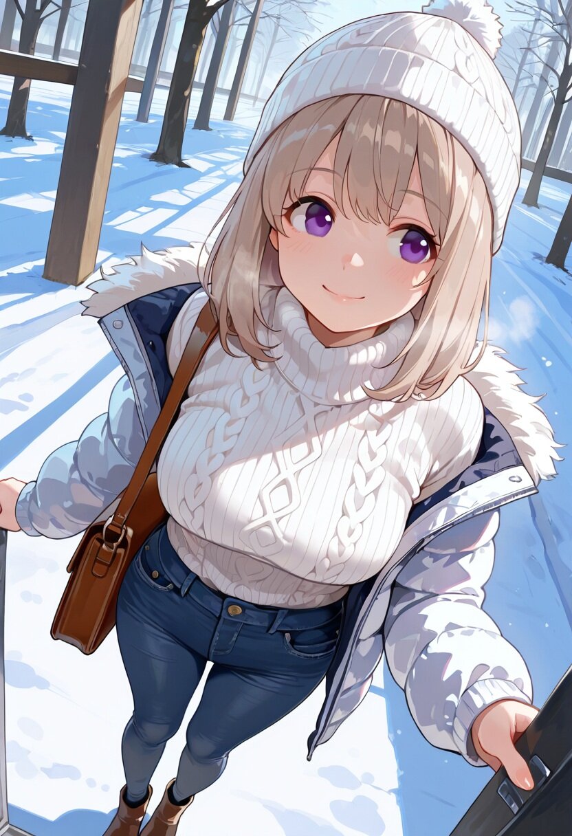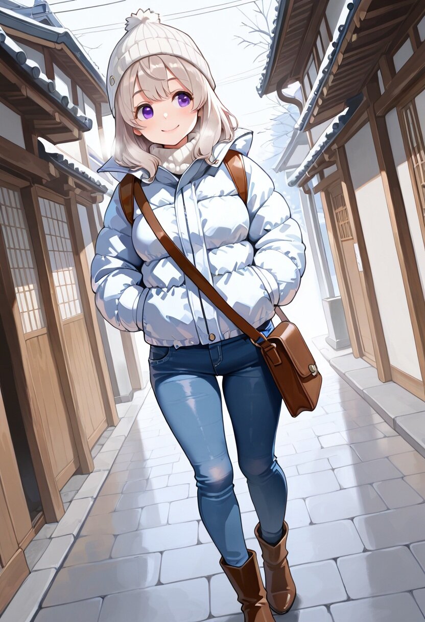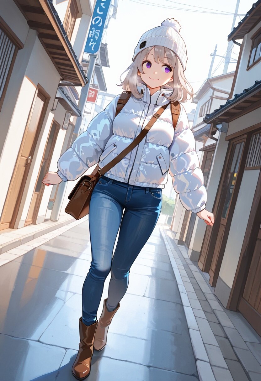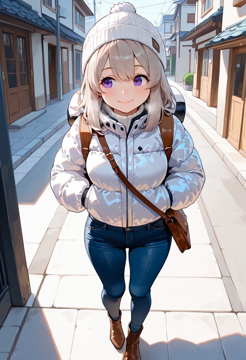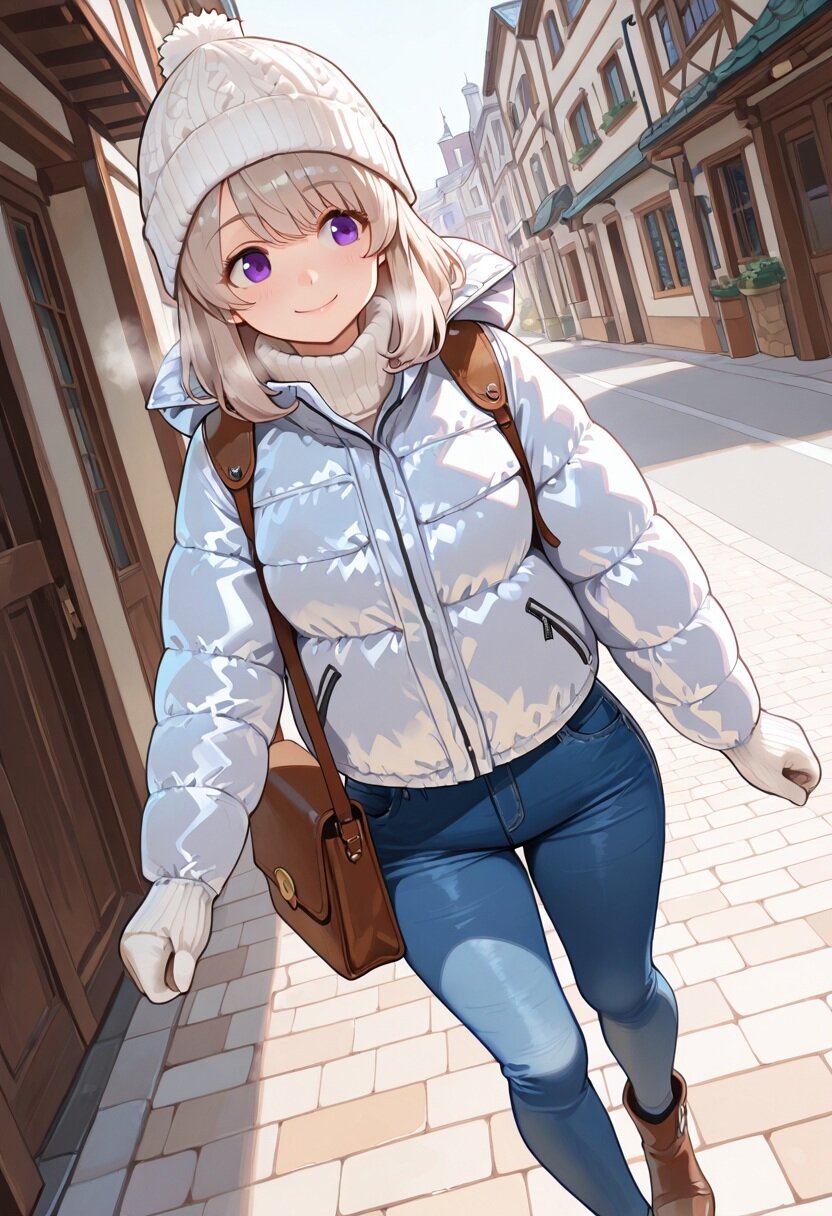 masterpiece, best quality, very aesthetic, absurdres, highres,sharp focus, HD,dutch angle,full body, outdoors,residential street,winter, morning,cold, BREAK 1girl, solo, (young,adult, 20 yo), cute, perfect body, detailed face, detailed skin, light brown hair, purple eyes,(large eyes, round eyes:1.2),tareme, (detailed eyes), nostrils, medium hair, curl outward hair, medium breasts, smile, breathing, looking at another, walking, white knit cap, ((white down jacket:1.2)), denim jeans, brown long footwear, white knit mitten, saddle flap shoulder bag,
