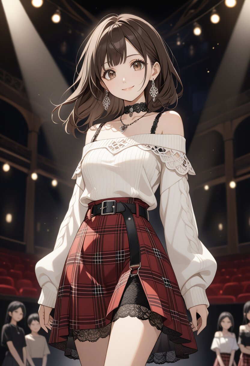 best quality,absurdres,8k,ultra detailed,full body,A young Asian woman is depicted in an anime style, center-framed. She has long, dark brown hair and large, light-colored eyes. Her expression is neutral with a slight hint of a smile. She wears a white, off-the-shoulder sweater with intricate lace detailing, a black lace choker, and a black, heavily-buckled belt. Below the belt, she is wearing a red plaid skirt. The woman is also wearing ornate earrings and a necklace with multiple strands. The background is blurred, suggesting a stage or a brightly lit environment. The lighting is bright, casting soft shadows, and emphasizes the details of the clothing and the woman’s features. The overall atmosphere is fashionable and stylized, with a slight gothic aesthetic.