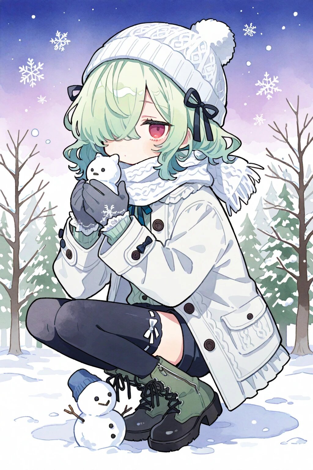 ニットキャップ、マフラー、コートを白で統一、髪色、インナー、ブーツを緑で統一してるコーデ良いなぁ…。あとコーデとは関係ない部分ですが雪だるまが可愛くてツボでした。
