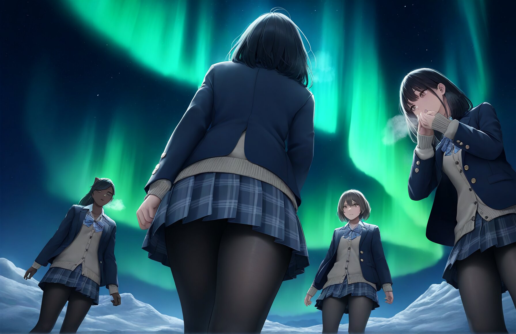 multiple girls, diamond dust, (photorealistic:1.1), (ultra high res:1.1), (8k:1.1), (official cg illustration:1.1), super detailed hair, super detailed skin, antarctic, night sky, aurora, snow field, white friezing breath, friezing eyelashes, standing, upskirt, from below, starnight, cold, back shot, blizzard, portrait, detailed eyes, cardigan, skirt, school uniform, blazer, shirt, bow, white shirt, bowtie, plaid, open jacket, open clothes, collared shirt, muffler, pantyhose, dark-skinned female, night, dark skin, jacket, sky, plaid skirt, (masterpiece:1.1), (best quality:1.1) <lora:add-detail-xl:0.66> <lora:DetailedEyes_V3:0.67> <lora:school uniform cardigan_pony_V1.2:0.65> <lora:dark:0.66> <lora:MultipleGirlsGroup:0.7>