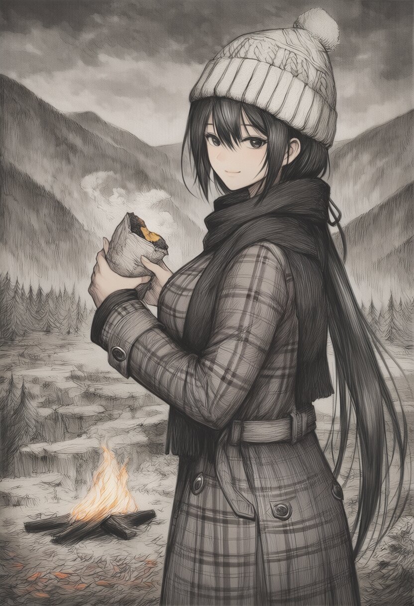 {{traditional media}}, {{highly detailed}}, {{{ink wash painting sumi-e}}}, {{ink stain}}, {{monochrome}}, {{textured paper}}, {{uneven brushstrokes}}, {{ink painting}}, {{{black theme}}}, {{gray sky, cloudy sky}}, 1girl, solo, black eyes, very long hair, straight hair, black hair, hair between eyes, low ponytail, light smile, big breasts, large breasts, closed mouth, {{ligh smile}}, {{white knit hat, tartan check coat, black scarf}}, {{{looking back, cowboy shot}}}, {{eat roasted sweet potatoes}}, autumn leaves, forest, bonfires, outdoors, no humans, {{{masterpiece}}}, {{{best quality}}}, {{{very aesthetic}}}, {{{ultra-detailed}}}, {illustration}, {{{extremely detailed}}}, {{{an extremely delicate and beautiful}}}
