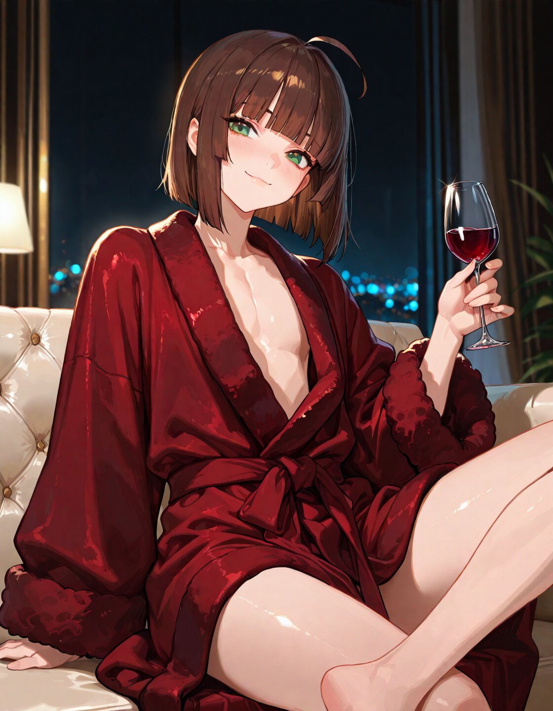 solo,1boy,brown hair,ahoge,short hair,straight hair,hime cut,blunt bangs,green eyes,delicate face,detailed face,detailed skin,detailed clothes,masterpiece,best quality,insanely detailed,beautiful,16k,delightful,litht smile,flushed cheeks, luxurious dark red fluffy fleece bathrobe,sitting on sofa,cross-legged,with a wine glass,at night,in the luxurious living room,chil latmosphere,bloom,soft lighting,in focus with blurred background
