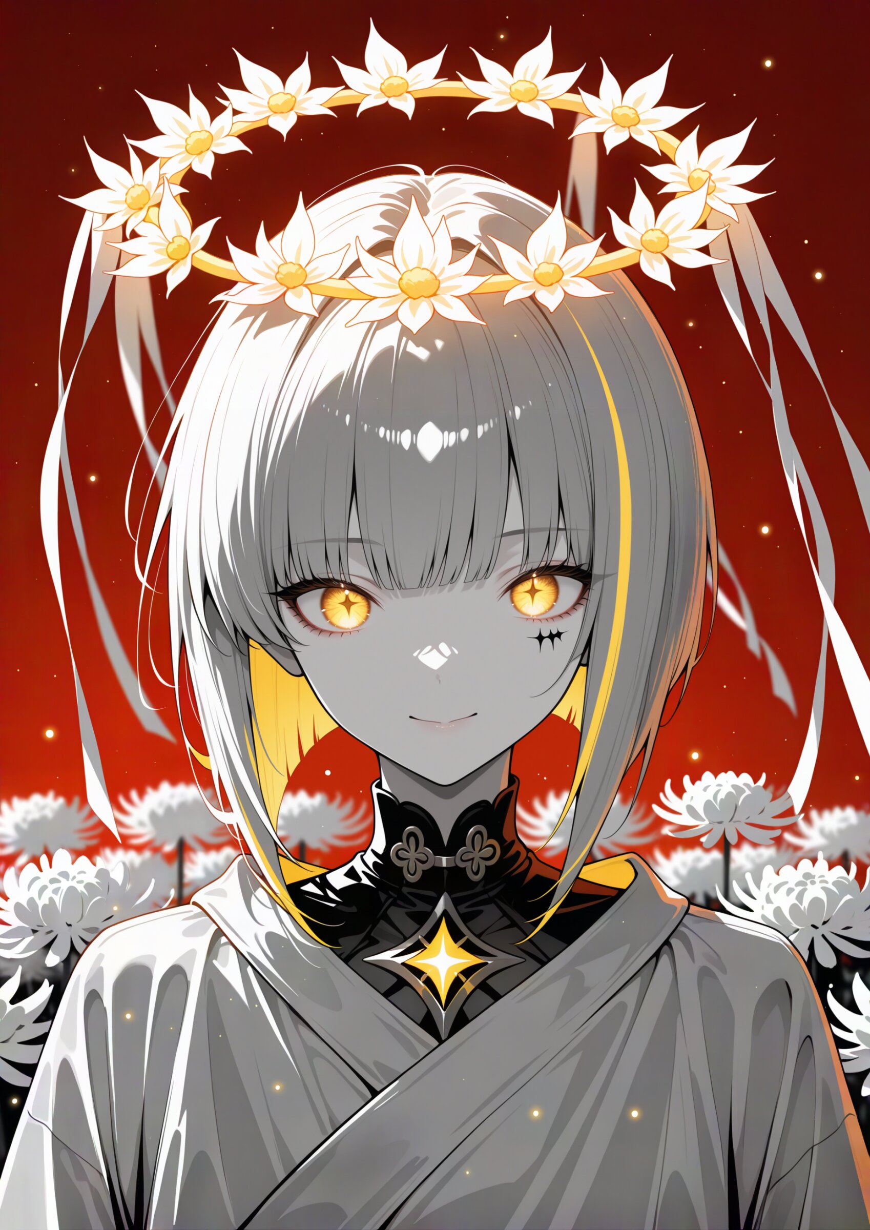 (portrait:1.2) (from above,looking up:1.0) red background, sumi-e, faux traditional media, color ink \(medium\), painting \(medium\), calligraphy brush (medium), , spot color, 1girl, ((inverted bob)), (((detailed anime face))),((beautiful detailed face)), gray hair, ((colorful hair)),((streaked hair)), beautiful citrine eyes,(citrine eyes:1.3), multiple-colored hair, (colorful hair:1.4), cute face, sparking eyes, eye shadow,, flower halo, collar, white cloth, (extremely delicate and beautiful fabric), detailed clothes,, glowing flower, cool, angel smile haughty face smile (emotional:1.1), (gently smile:1.2),(closed mouth:1.2), (chrysanthemum indicum:1.2), (surrounded by chrysanthemum indicum:1.0), chrysanthemum indicum petals, flower field, (high saturation:1.0), plantar flexion sidelighting, super fine concept art, hard surface, graceful eyes, masterpiece, best quality, amazing quality, very aesthetic, absurdres, newest, professional art lots of details, , overexposure, sumie effect style, 4ur4_illu,shiny, glowing, glowing particles, glowing light particles, light particles, wind streamers, <lora:noline (1):-0.5> <lora:sdxl2-flat2-512b:0.0> <lora:facelightup_xl_v10:0.5> <lora:V2_yakumo_alchemy:0.5> <lora:Aura_illu:0.1>