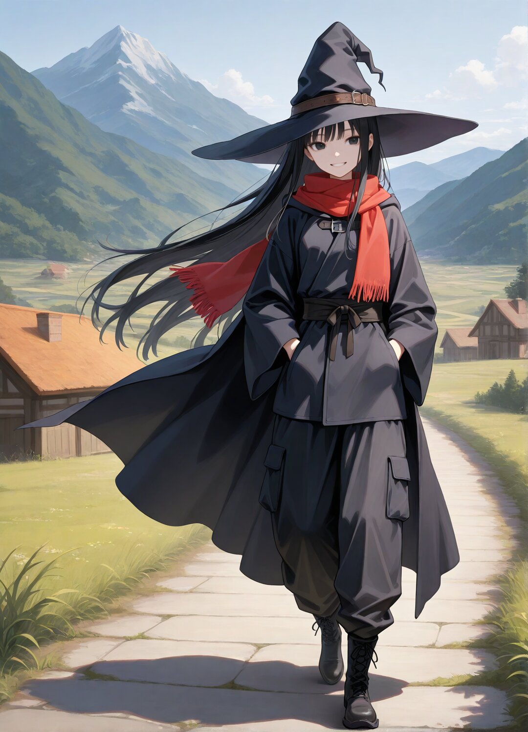 masterpiece,best quality,highres,highly detailed,detailed eyes,general,1girl,solo,17yo,(hands in pockets,black Witch hat,long red scarf,grin,light smile),cute girl,slender,small breasts,very long sleeves,black hair,long hair,bangs,black eyes,Witch girl,(long black Witch cloak, long black Witch robe, black obi,long black cargo pants),boots,slender girl,walking,beautiful detailed landscape,fantasy,full body,