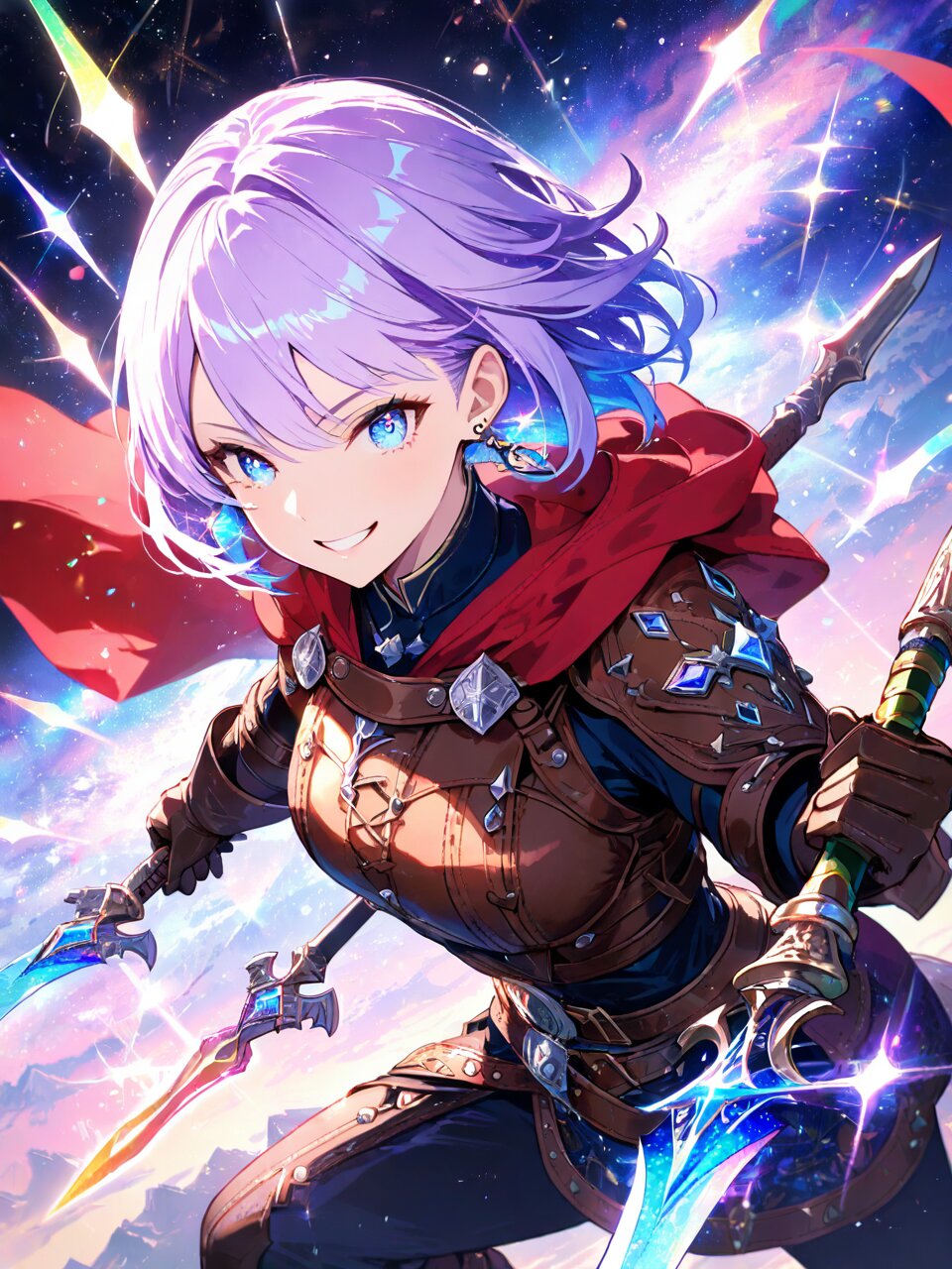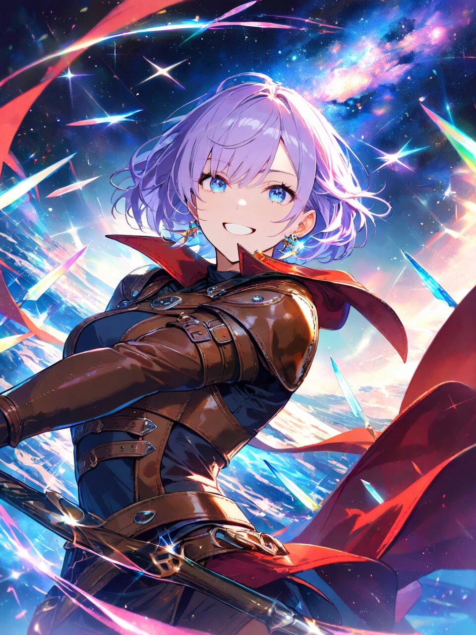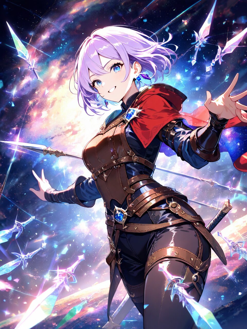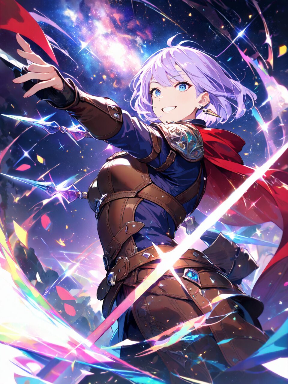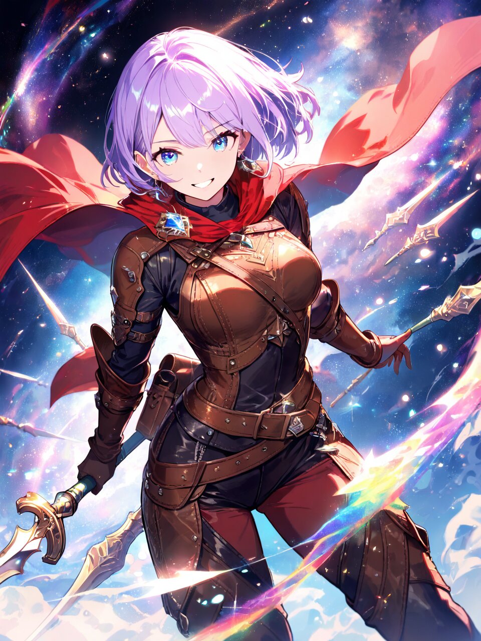 floating thousand knife, fantasy setting, prism effect, particles of light, shining background, galaxy, starlight, wearing leather armor, red cape, woman, grin, smile, short hair, light purple hair, blue eyes, pierced earrings