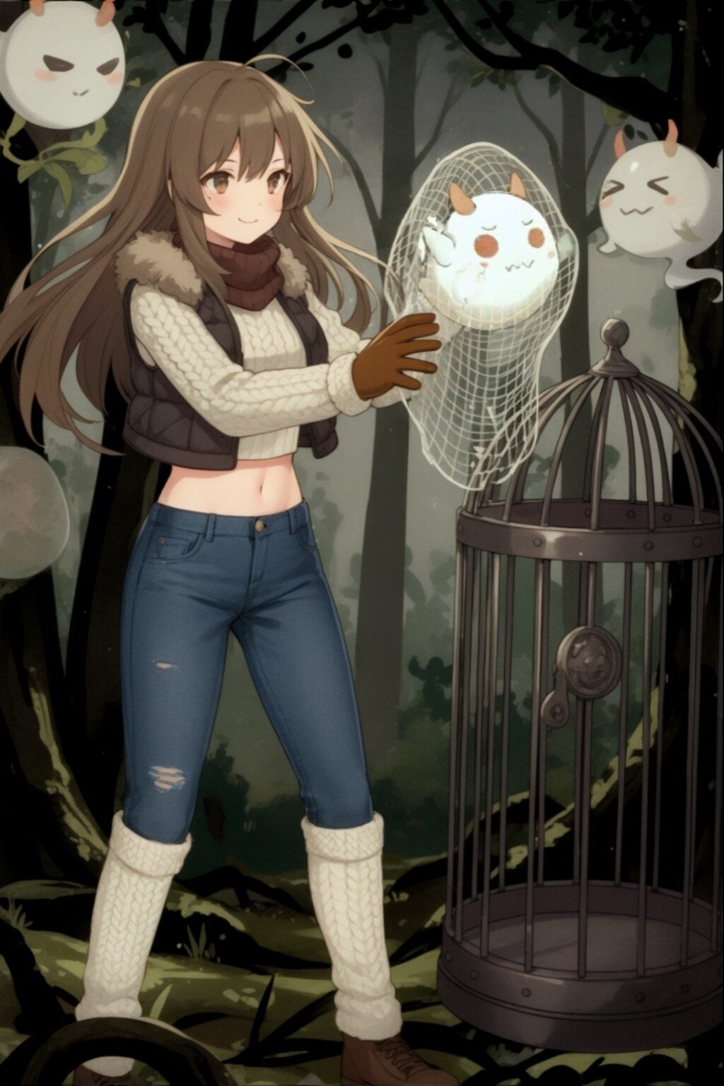 Anime style, a full-body shot of a young girl standing in a dark, overgrown forest, catching a small, cute ghost in a net. She has long brown hair and a gentle smile. She is wearing a crop top knit sweater, a puffy vest, ripped black jeans, white fluffy leg warmers, and brown gloves. A vintage-style cage stands next to her. The forest background is deep and shadowy with sparse light filtering through the trees, giving a mysterious and slightly eerie atmosphere. Two other small, mischievous ghosts float in the background. Subtle glow from the caught ghost.