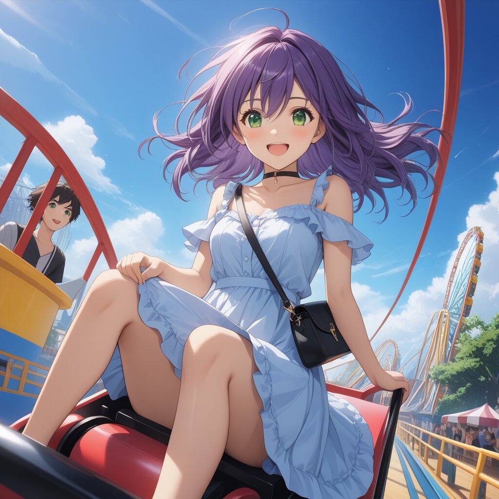 masterpiece, best quality, photorealistic, sharp focus, cinematic lighting, depth of field, beautiful composition, vibrant colors, ultra high res, 8K, highly detailed, masterpiece, best quality, very detailed, score_9, score_8_up, score_7_up, source_anime, chainsawreze, lora:chainsawman-reze-ponyxl-lora-nochekaiser:1, reze, black choker, purple hair, choker, eyebrows hidden by hair, green eyes, hair between eyes, long bangs, medium hair, smile, adorable summer dress, sandals, small shoulder bag, riding a roller coaster, wind in hair, thrilling expression, high in the air, funfair, vibrant lights, date, looking at viewer, dutch angle, cowboy shot