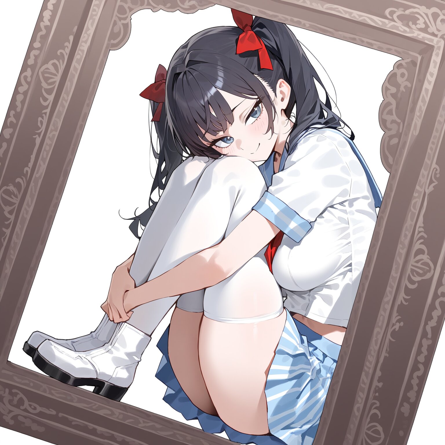A girl crammed into a frame,full body, a girl curled up,,serafuku,miniskirt,vertical-striped_skirt,thighhighs,thighhighs_under_boots,seductive_smile,white_background,simple_background,1girl,loli,bishoujo,black hair,twintails,big breasts,narrow_waist,tsurime,early teen,