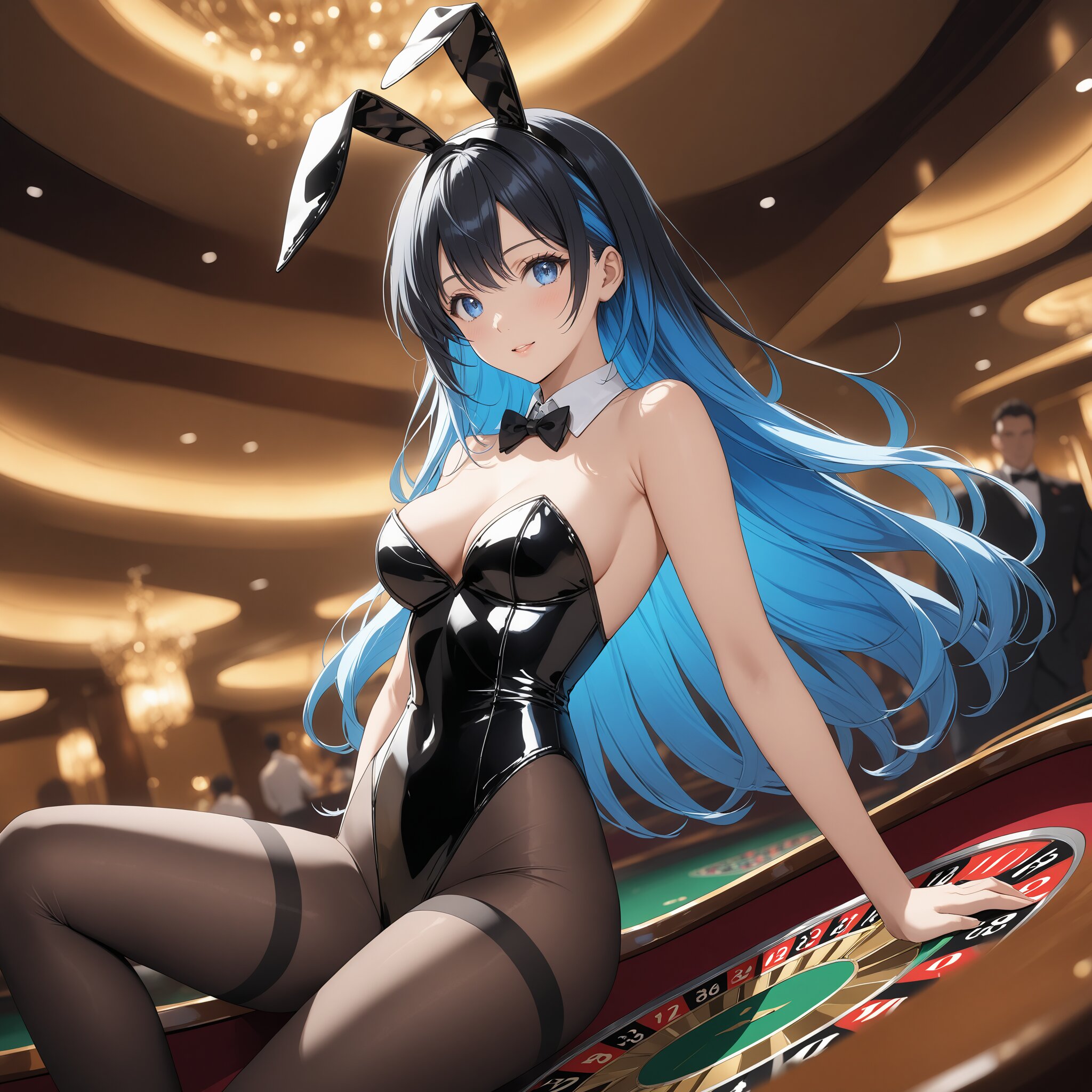masterpiece, best quality, photorealistic, sharp focus, cinematic lighting, depth of field, beautiful composition, vibrant colors, ultra high res, 8K, highly detailed, masterpiece, best quality, very detailed, score_9, score_8_up, score_7_up, source_anime, lora:akane-kurokawa-s2-ponyxl-lora-nochekaiser:1, akane kurokawa, long hair, bangs, blue eyes, black hair, blue hair, multicolored hair, gradient hair, lora:translucent-bunnysuit-ponyxl-lora-nochekaiser:1, translucent bunnysuit, bow, animal ears, bare shoulders, pantyhose, bowtie, rabbit ears, leotard, black pantyhose, strapless, black bow, detached collar, fake animal ears, playboy bunny, strapless leotard, thighband pantyhose, black bowtie, casino, teasing expression, hand on hip, slight head tilt, playful, alluring gaze, full body shot, dynamic angle, cowboy shot, dutch angle