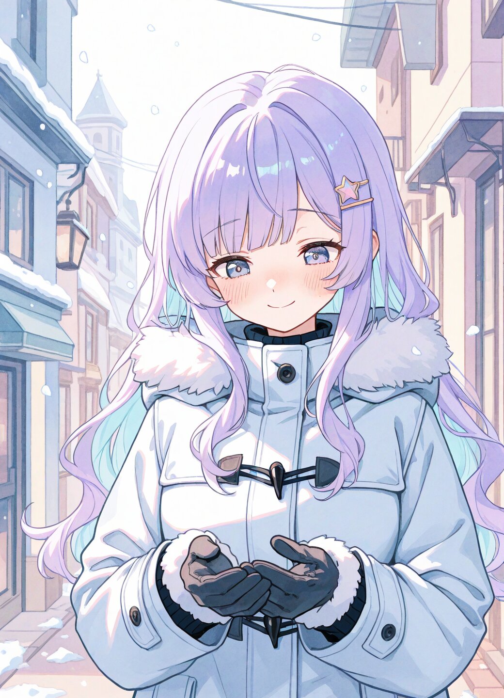 soft winter daylight, girl wearing an oversized men's coat and fluffy gloves, gently adjusting one glove while looking down with a shy smile, faint blush on cheeks, light snow falling, cozy city street background, warm brown and gray tones, soft backlight, calm and romantic atmosphere, masterpiece, best quality, amazing quality, solo, kawaii, cute, soft anime face, teenage, pastel purple hair, (light blue inner hair:1.3), fluffy long hair, loosely wavy hair, straight-cut bangs, star-shaped hairpin, calm violet eyes, medium breasts, (soft pastel color palette:1.5), (pale colors:1.3), watercolor texture, matte finish, subtle shading, minimal contrast
