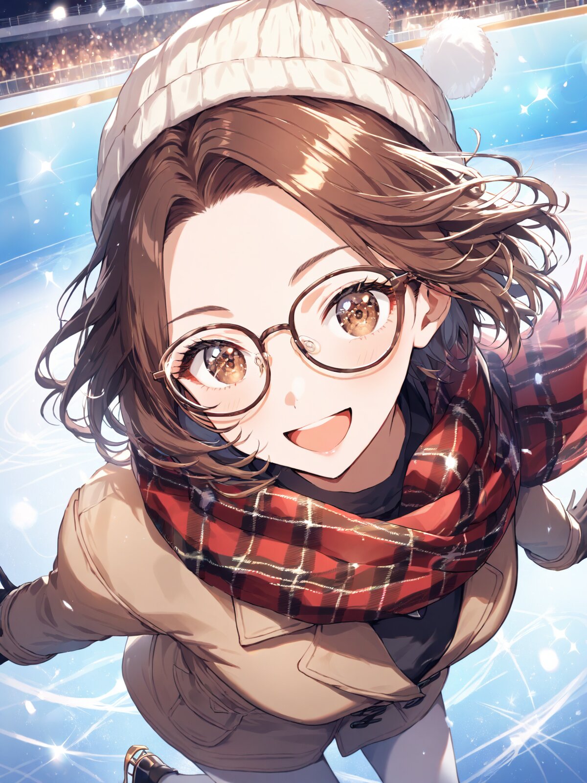 smile, short hair, brown hair, brown eyes, forehead, glasses, open mouth, winter fashion, tartan check stole, figure skating shoes, gloves, hat, ICE skating rink