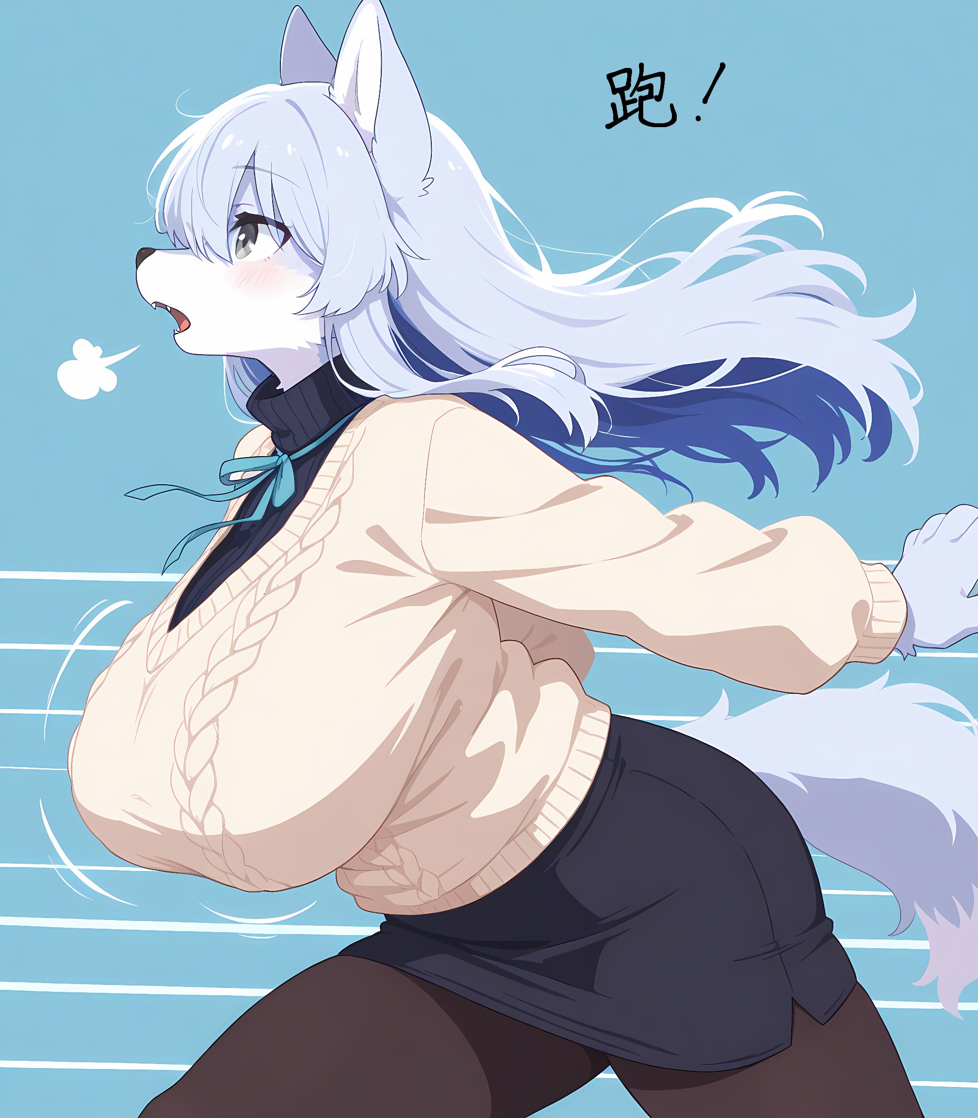 1girl, wolf girl, furry female, (snout:1.3), blue fur, wolf ears, ears up, wolf tail, body fur, fluffy fur, wolf paws, (gigantic breasts), sagging breasts, slim, wide hips, thick thighs, silver hair, hime-cut, long hair, colored inner hair, hair between eyes, hair over eyes, silver eyes, long bangs, expressionless, unemotional, light-open mouth, puff of air, revealing clothes, undersized clothes, high collar, black collar, blue neck ribbon with loose ends, layering, separated turtleneck and sweater vest, v-neck beige sweater, aran sweater, black turtleneck under sweater, long sleeves, black skirt, pencil skirt, black pantyhose, running, leaning forward, legs apart, motion lines, motion blur, motion trail, afterimage, speed lines, floating hair, from side, profile, looking ahead, blue striped background, simple background, hair shade, ((high contrast)), (digital art:1.1), (anime coloring), (kawaii), softy, (2D), (cute), furry, (two tone fur), (furry body), perfect body, detailed face, high quality, cute clothes, animal tail, animal ears, solo, masterpiece, ((correct_anatomy)), pretty and cute, comical, simple, anime, Bright colors, Contour line, pale painting, (detailed_hands:1.5), flat color, no lineart, close-up, eye focus