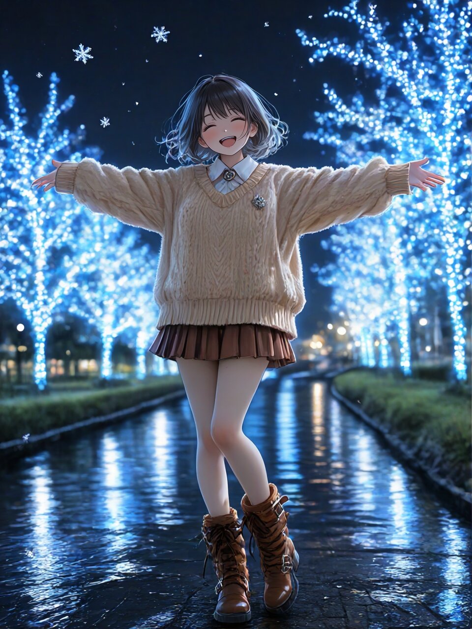 1girl, solo, standing, smile, Spreading both arms wide with satisfaction, on the lock, big smile, open mouth, //冬コーデ cute winter outfit, oversized beige knit sweater with fluffy texture and soft folds, white shirt collar peeking from neckline, small silver brooch on chest, paired with short pleated brown skirt, warm and cozy design, thick brown lace-up boots with large straps and buckles, soft pastel color tone, anime illustration style, flat colors, isolated outfit, //ロケーション A nighttime scene of an urban park lined with trees adorned with bright blue string s. The trees form a tunnel-like archway over a dark waterway that reflects the s, creating a mirrored effect. The s illuminate the scene with a deep blue glow against the black sky. People can be seen standing on the left side, as well as along the walkway, forming a line. The perspective is centered, drawing the eye down the path. The overall atmosphere is festive and magical, suggestive of a winter holiday display or a nighttime show. The image is crisp and well-lit, emphasizing the contrast between the dark environment and the vibrant blue s.
