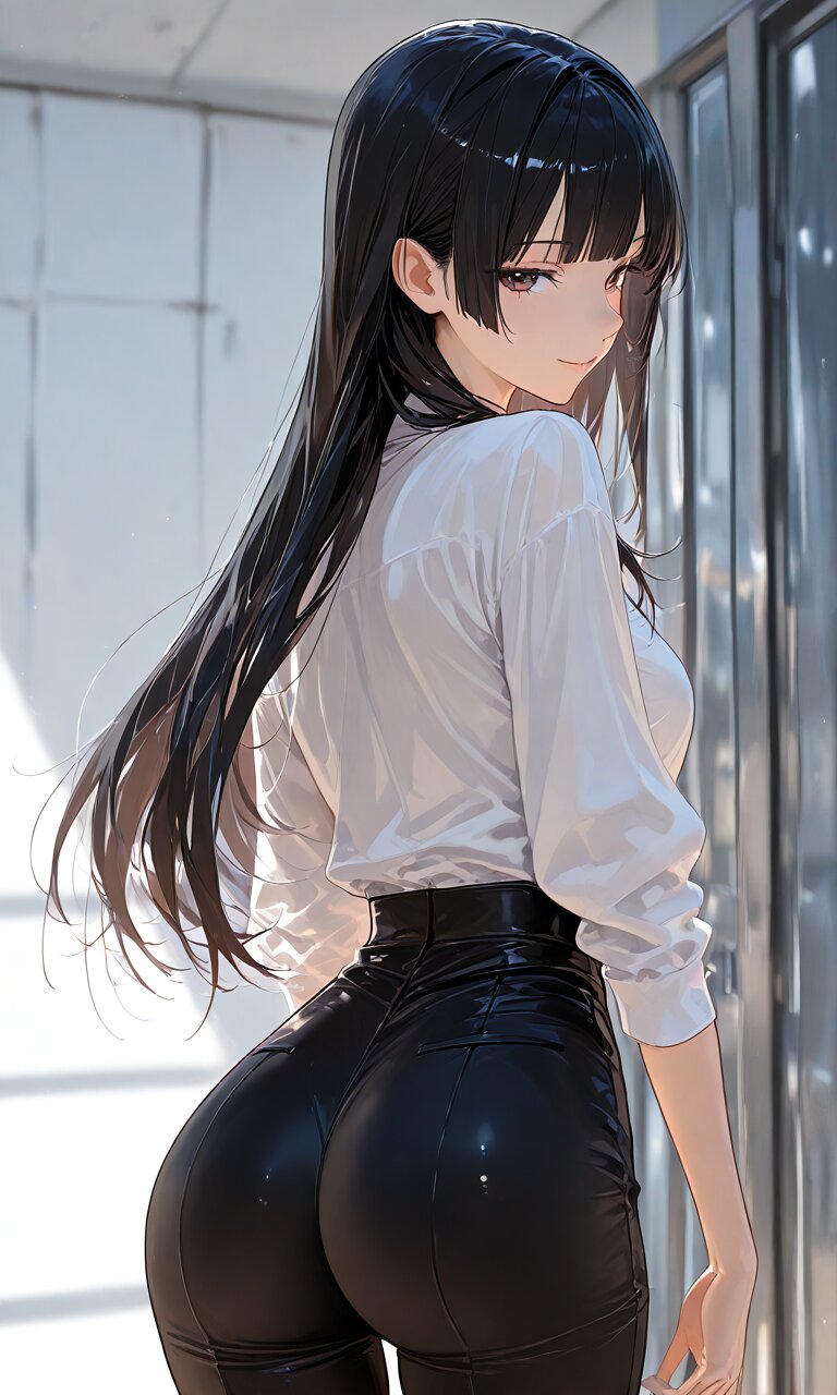 (best quality),(masterpiece),(ultra detailed),1 lady, (long hair, hair emphasized), black hair, blunt bangs, , (from back), looking back, cowboy shot, white shirt, black pants