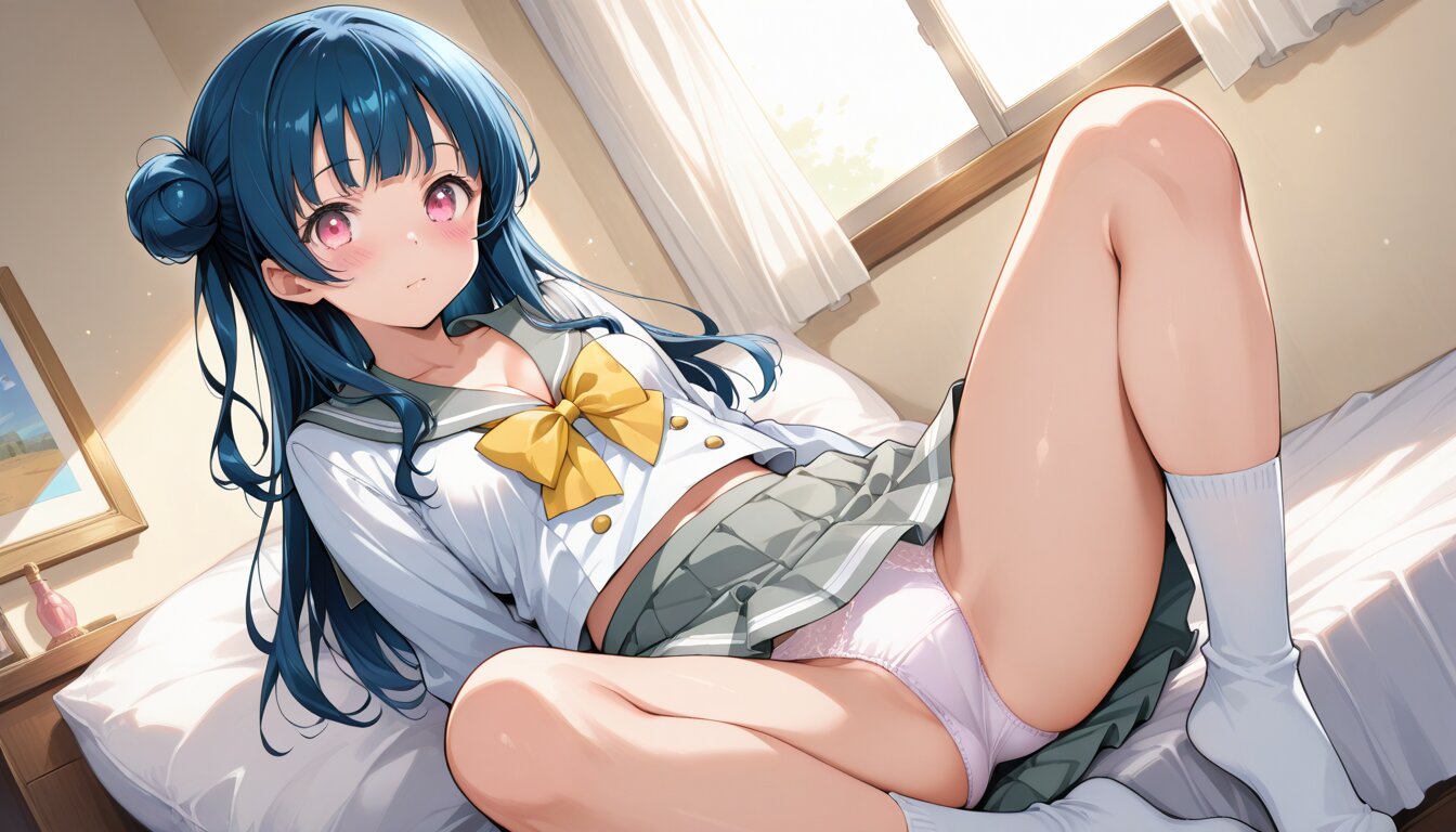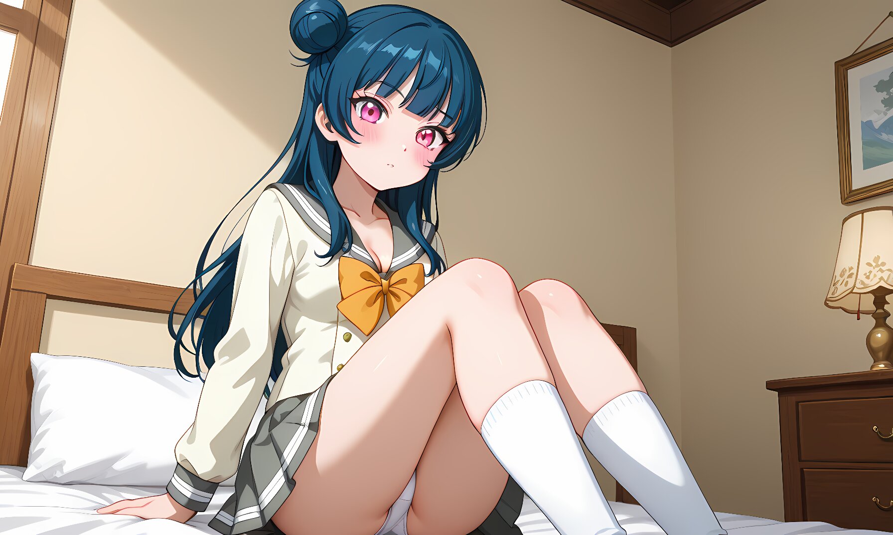 masterpiece,best quality,amazing quality,general, fine detail, official art, 1girl, cute face, a digital illustration of a young girl sitting on a pink coversp, 1girl, underwear, panties, <lora:yoshiko-tsushima-s2-ponyxl-lora-nochekaiser:1>, yoshiko tsushima, long hair, bangs, blue hair, pink eyes, hair bun, single hair bun, single side bun, uranohoshi school uniform, yellow ribbontie, small breasts, skirt, cleavage, socks, white panties, school uniform, blush,