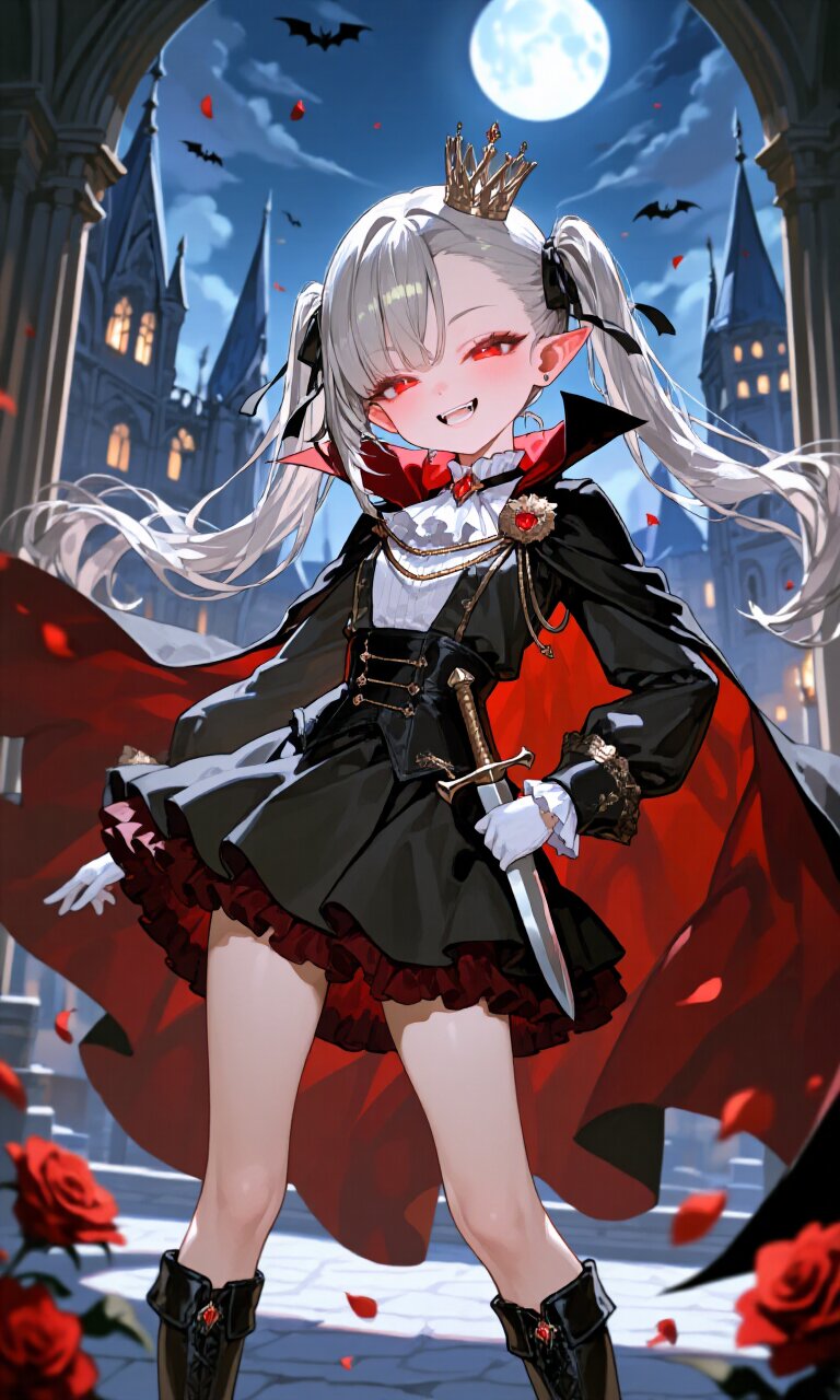 A petite young girl with a childish yet elegant appearance stands proudly in a gothic palace courtyard at midnight. She has silver hair styled in (long twin tail:1.5) with asymmetry bangs, vivid red eyes that glow faintly under the moonlight, and small fangs peeking from her delicate smile. Her fair skin and detailed facial features give her an almost doll-like beauty, with squinting eyes adding to her mischievous charm. She wears a (Black luxurious Prince costume:1.6) with long sleeves, accented by a (Dark red luxurious Cape:1.3) billowing dramatically behind her. The outfit includes a (luxurious mini skirt with Darkred frill:1.4), (black luxurious boots:1.3), and crisp (White gloves:1.2). A (dagger on waist:1.3) and a gleaming (crown:1.3) complete her regal vampire aesthetic. Surrounded by gothic architecture, she strikes a cute pose with one hand resting confidently on her hip, emphasizing her narrow waist and (petite hip::1.5). Moonlight casts soft lighting over the scene, illuminating drifting petals and fluttering bats in the background. The romantic academia atmosphere blends dark elegance with fairy-tale whimsy, creating an insanely detailed masterpiece of gothic beauty.