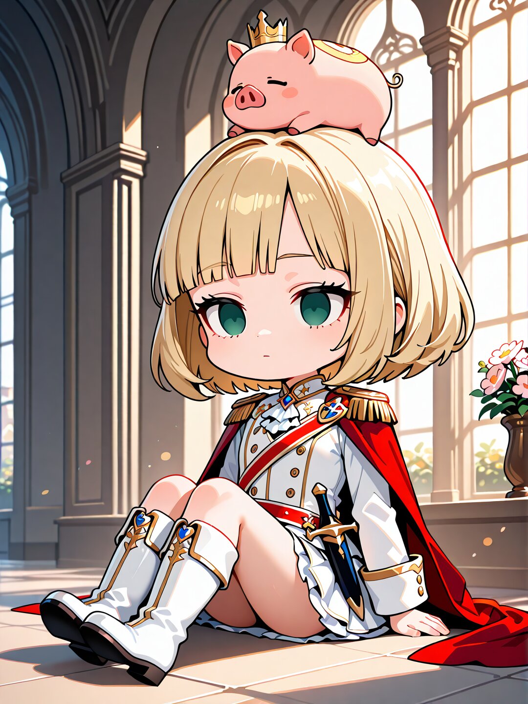 solo,1boy,cute,kawaii,ahoge,green eyes,blonde hair,bob cut,hime cut,blunt bangs,straight hair, delicate face,detailed face,detailed skin,detailed hair,detailed hair,masterpiece,best quality,insanely detailed,beautiful,16k,(White prince costume:1.4),(red cape:1.2),long sleeves,flat chest,(dagger on waist:1.3),(mini skirt:1.4),white luxurious Boots,prince charming,medieval europe,expressionless, palace,flower,in the afternoon,calm atmosphere,classic academia,romantic academia,lens flare,sunlight,sunbeam,bloom,soft lighting,(white luxurious panty;1.2),empty eyes,sitting on the floor,1pig on head,wearing boots,cute,chibi,expressionless,empty eyes,(chibi:1.5),deformed