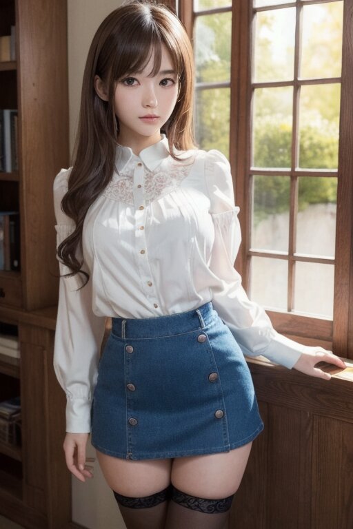 masterpiece, hyper detailed, 8K, hyper detailed illustration,extremely detailed CG, Japanese woman, 23yo, (cute:1.1), (pretty:1.1), hyper detailed face, hyper detailed eye, beautiful eye, extremely detailed, medium hair,(bangs:1.1), thin, tall, perfect anatomy, perfect proportions, extremely detailed body, blouse, short skirt, thighhighs, hyper detailed background,