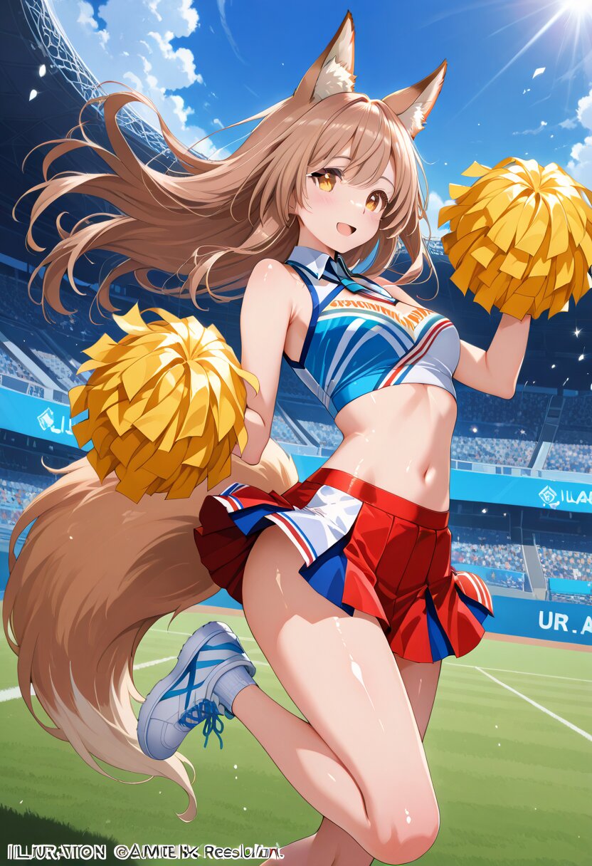 (high resolusion,illustration,ultra detailed 8k art,extremely detailed CG,official art,clothes reflecting light,detailed shiny skin,detailed background:1.3), ((highly detailed beautiful face and eyes),anime style, fox ears girl, light brown hair, long hair, double eyelids, long eyelashes, fluffy tail, dynamic angle, dynamic pose, cheerleader outfit, jumping, mid-air motion, energetic expression, pom-poms, stadium background, wind-blown hair, vibrant colors, fantasy realism, cinematic composition, ultra-detailed