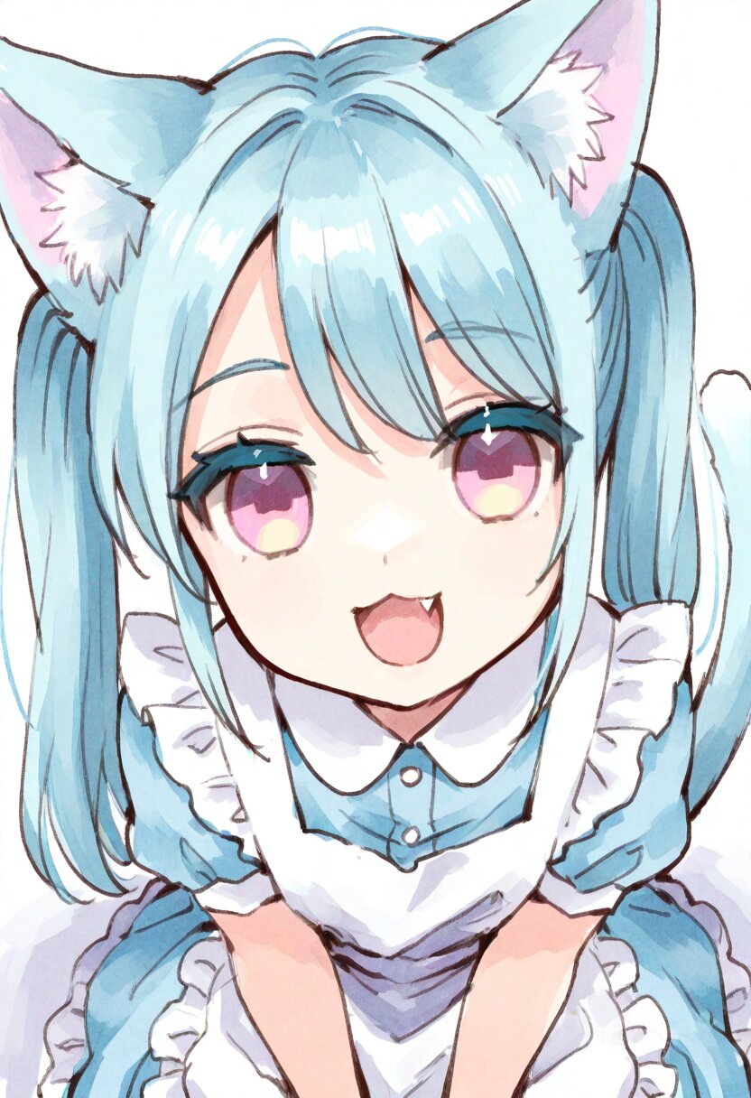 <lora:inmnstyleilxl:0.9>, , best quality, masterpiece, very aesthetic, watercolor painting, general, 1girl, light blue hair, twintails, cat ears, cat tail, light pink eyes, smile, open mouth, :3, fang, light blue dress, white apron, sitting, white background, long sidelocks <lora:erase_human_ear_v10_ill:1>