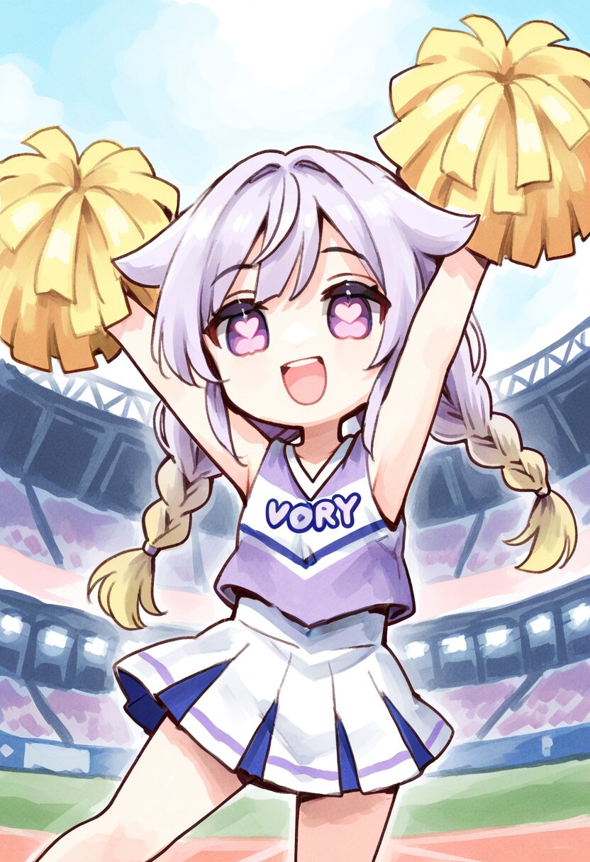<lora:inmnstyleilxl:0.9>, best quality, masterpiece, very aesthetic, general, watercolor painting, 1girl, chibi, solo, lightpurple cheerleader costume, _, twin braids, _, gradient hair, hair flaps, ivory colored inner hair, mediumaquamarine eyes-colored, heart-shaped pupils, holding pompom, arms up, stadium, smile, open mouth, dancing, jump
