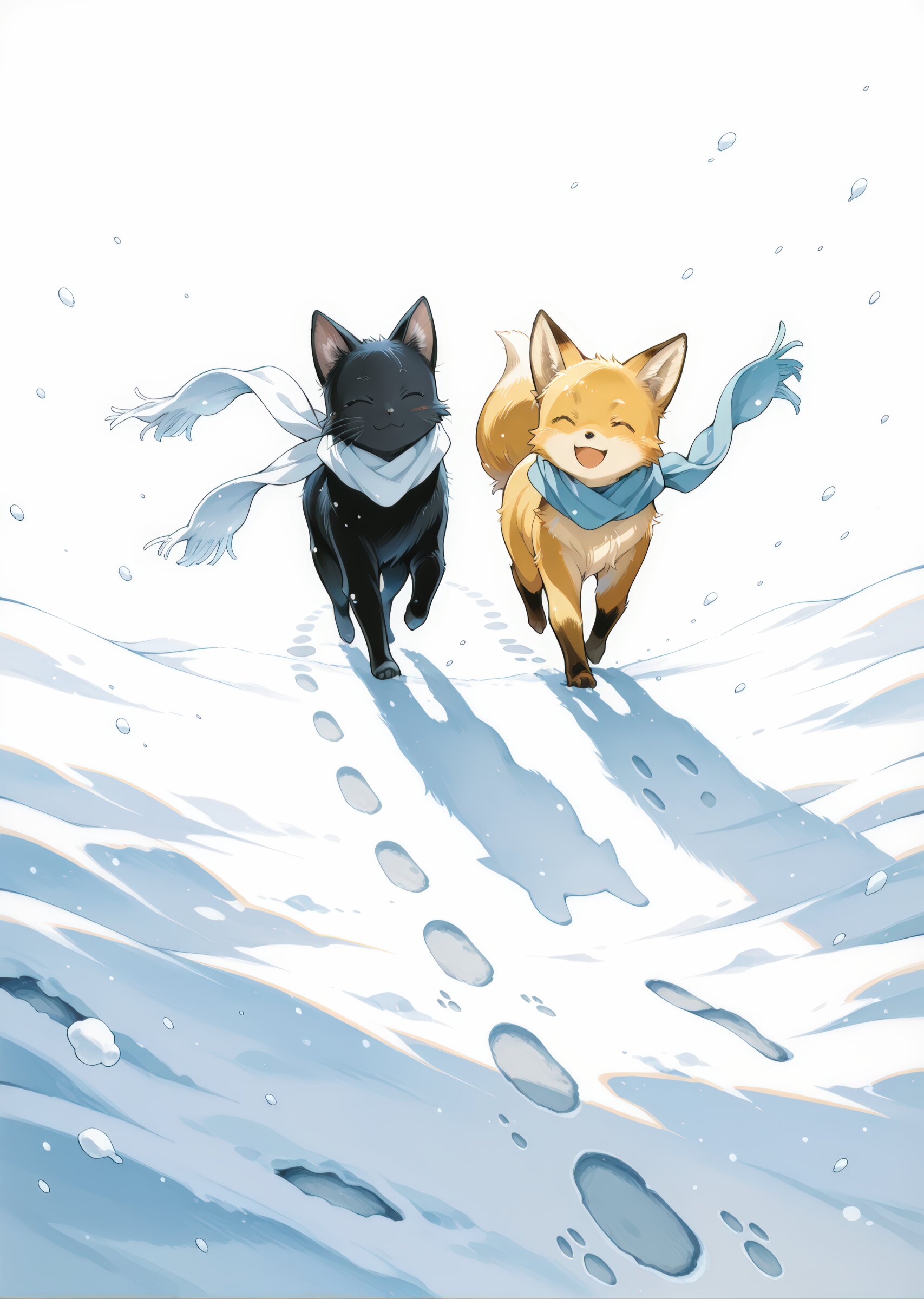 Best quality, Masterpieces, simple background, anime-style illustration, white background, fine detail, 2animals, cute small fox cub and black cat sharing one long scarf, walking together in softly falling snow, footprints in snow, warm friendship, soft light, serene winter scene, happy, no humans, <lora:EnvyZoomSliderXL01:2>, front view