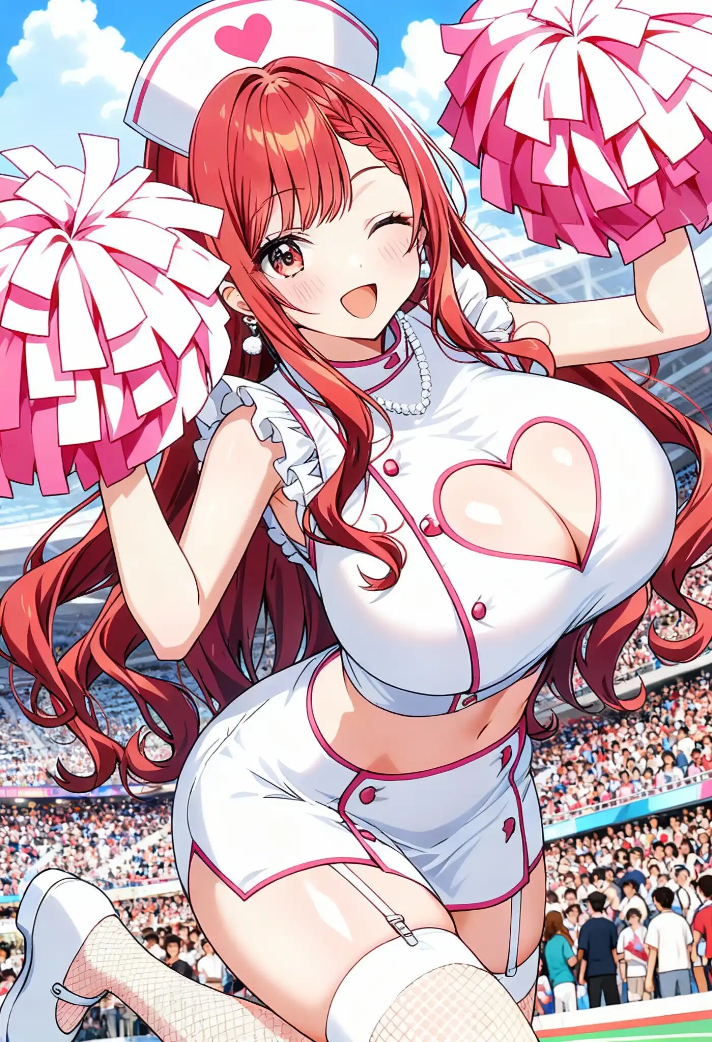 [a large heart cutout is edged in pink]++, [cleavage]++, [nurse uniform]++, [nurse cap with a heart-shaped design]++, [pom pom (cheerleading)]++, [huge breasts]++, perky breasts, hanging breasts, curvy, heart necklace, pearl necklace, heart earrings, BREAK sleeveless, [frilled shoulders]++, bare shoulders, bare arms, wrist scrunchie, white scrunchie, BREAK cheering, [midriff]++, [cropped nurse uniform]++, garter straps, BREAK [fishnet thighhighs]++, skindentation, cowboy shot, BREAK [Raise one hand]++, [leg up]++, tall, [long hair]++, [straight hair]++, [shiny]++, [shiny skin]++, [shiny clothes]++, [big eyes]++, [shining eyes]++, one eye closed, blush, smile, open mouth, BREAK [stadium]++, [audience]++, mary janes, outdoors, day, wavy hair,