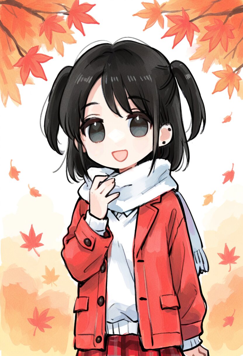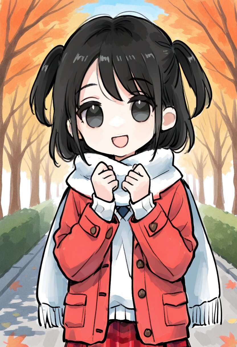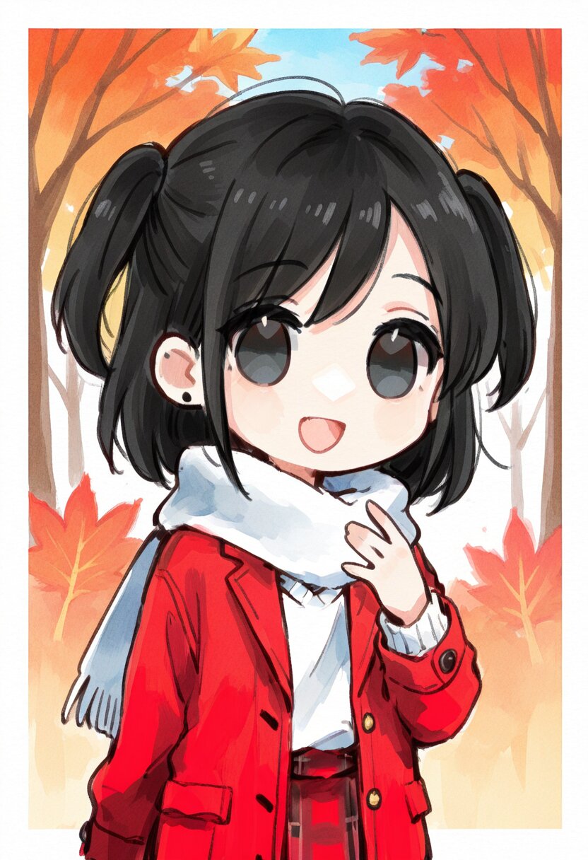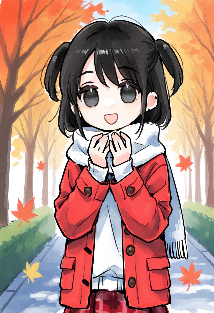 <lora:inmnstyleilxl:0.9>best quality, masterpiece, very aesthetic, watercolor painting, general, 1 girl, chibi, solo, black hair, two side up, black eyes, smile, open mouth, white scarf, red jacket, white sweater, red plaid skirt, upper body, autumn park