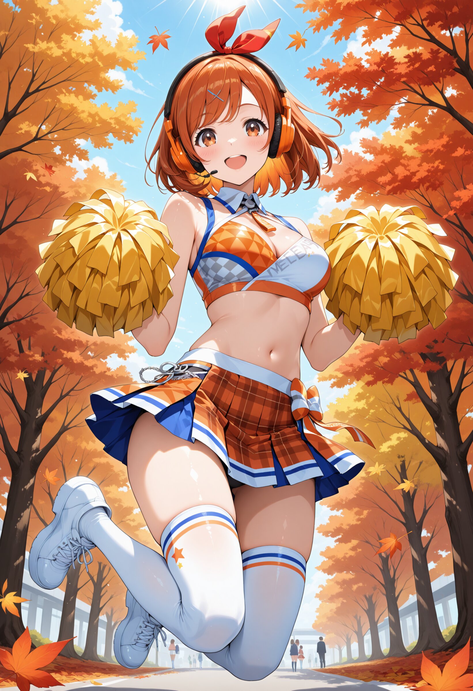 Zena, a Japanese idol cheerleader with vivid orange bob hair and orange headphones, surrounded by red and amber maple leaves. She wears a brown-and-cream cheer outfit with a plaid mini skirt, thigh-high socks, and a soft plaid muffler. She’s jumping mid-air, pom-poms raised high. Professional fashion photographer capture with mid-motion freeze, sunlight filtering through autumn leaves, bright and dynamic composition full of movement.