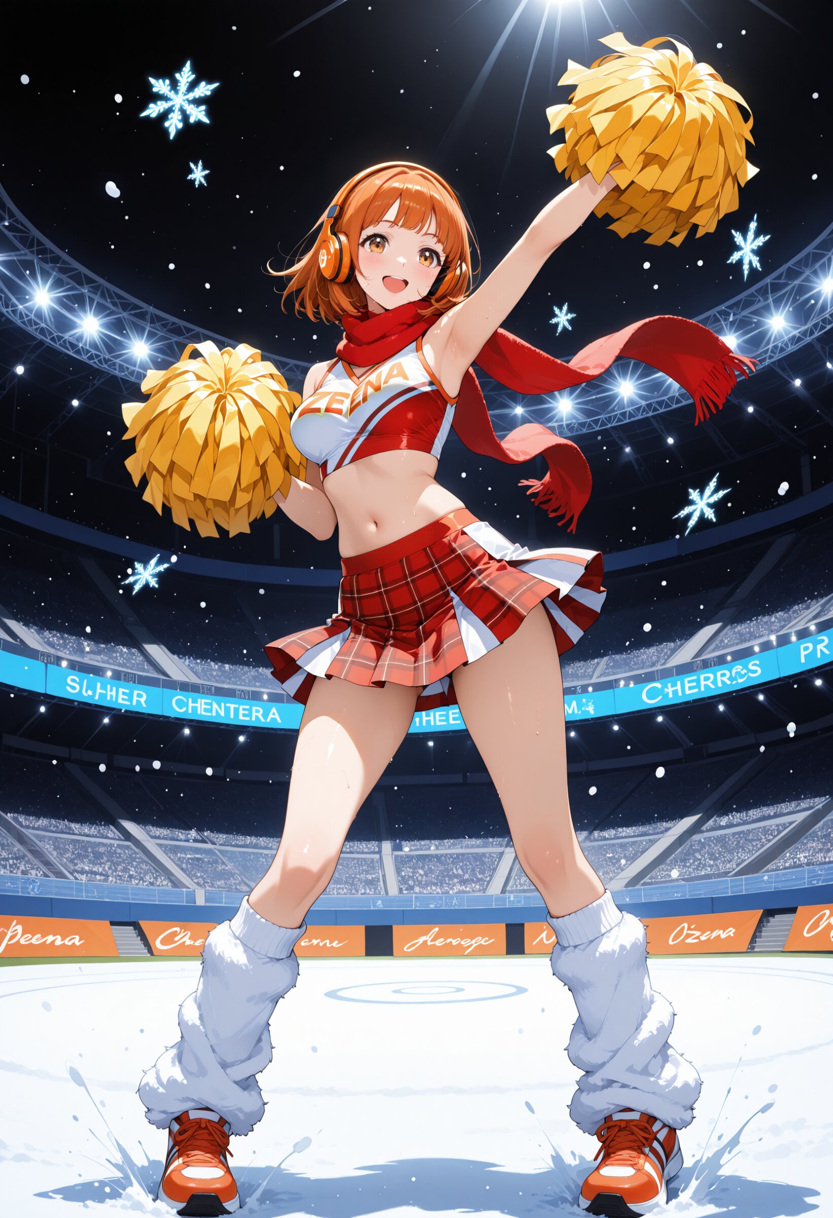 Zena, a passionate Japanese cheerleader with orange bob hair and orange headphones, wearing a red-and-white cheer outfit with a matching plaid mini skirt, fluffy leg warmers, and a thick red scarf wrapped around her neck. She cheers energetically in falling snow, pom-poms shimmering under stadium lights. Professional sports photographer composition, motion blur, spotlight contrast, and glowing snowflakes enhance the drama.