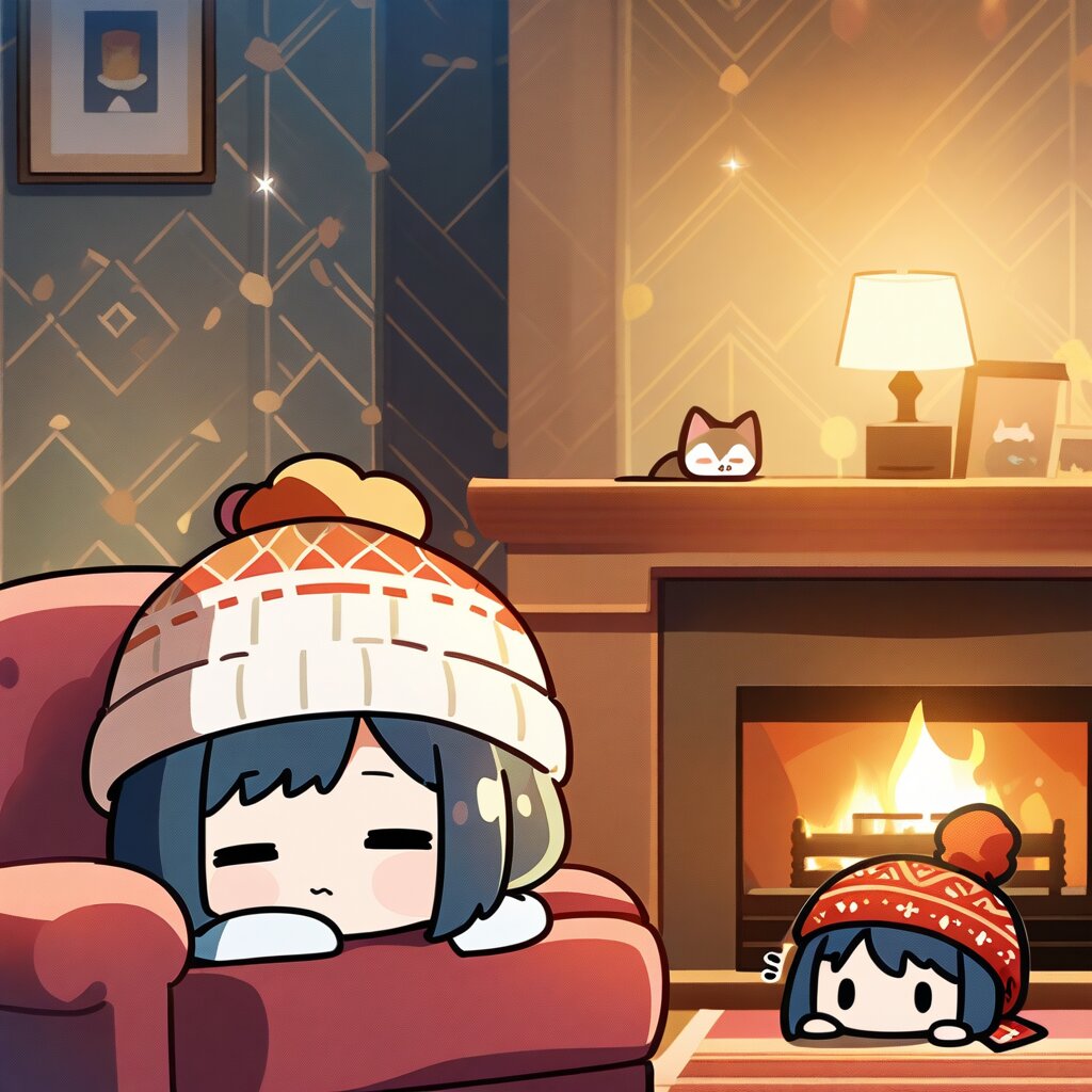 A cat, a sleeping girl, sparkling crystal lines, a girl wearing a red ribbon and a knitted hat, a complex and beautiful pattern. A living room with a fireplace, a girl sleeping soundly on the sofa, the unknown texture of the fireplace, the sparkle of the lamp, a scarf, a faint smile and a sleeping face. (anime style) (familiar face)chibi style.