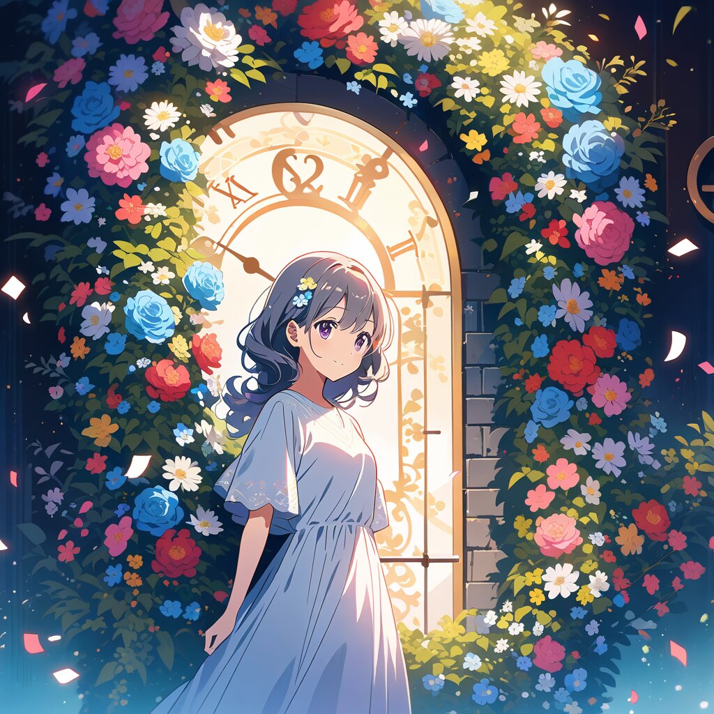 Anime style illustration, detailed line art, high gloss, brilliant lighting. A mysterious scene on a wall where transparent clock-like letters rotate. On the wall, flowers are blooming corresponding to directions: green flowers to the north, blue flowers to the east, red flowers to the south, and white flowers to the west. A beautiful girl is standing, with gray curly hair and purple eyes, smiling gently. The flowers appear to be merging with the girl and the wall. Mysterious flowers blooming all around.