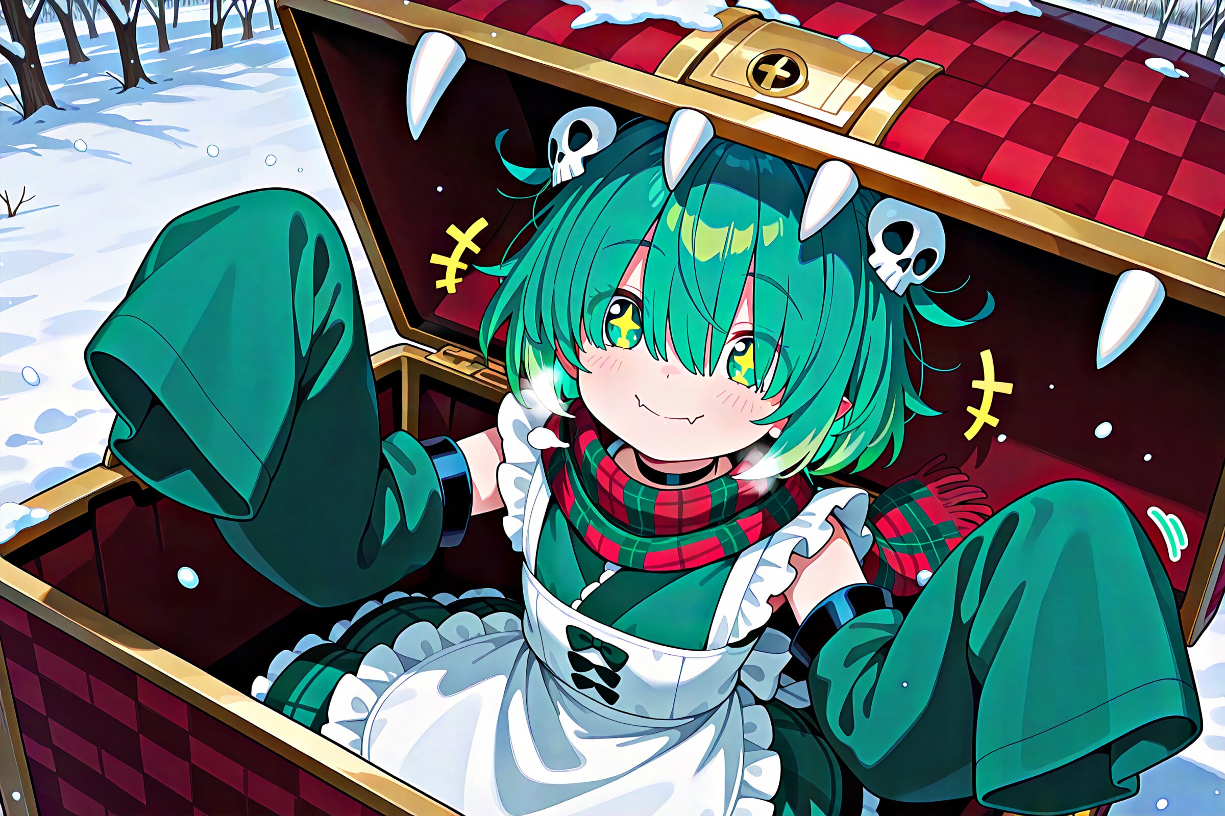 1 little girl, solo, diagonal angle, masterpiece, best quality, amazing quality, very aesthetic, cobalt green hair, short hair, messy hair, (hair over eyes:1.2), green eyes, demon fangs, +_+, closed mouth, smile, cheerful, +++, notice lines, white breath, choker, green wa maid outfit, (oversized sleeves:1.2), detached sleeves, (floating black ghosty hands:1.2), skull hair ornament, tartan-check scarf, checkered clothes, in mimic tartan-check chest, checkered chest, winter, snow,