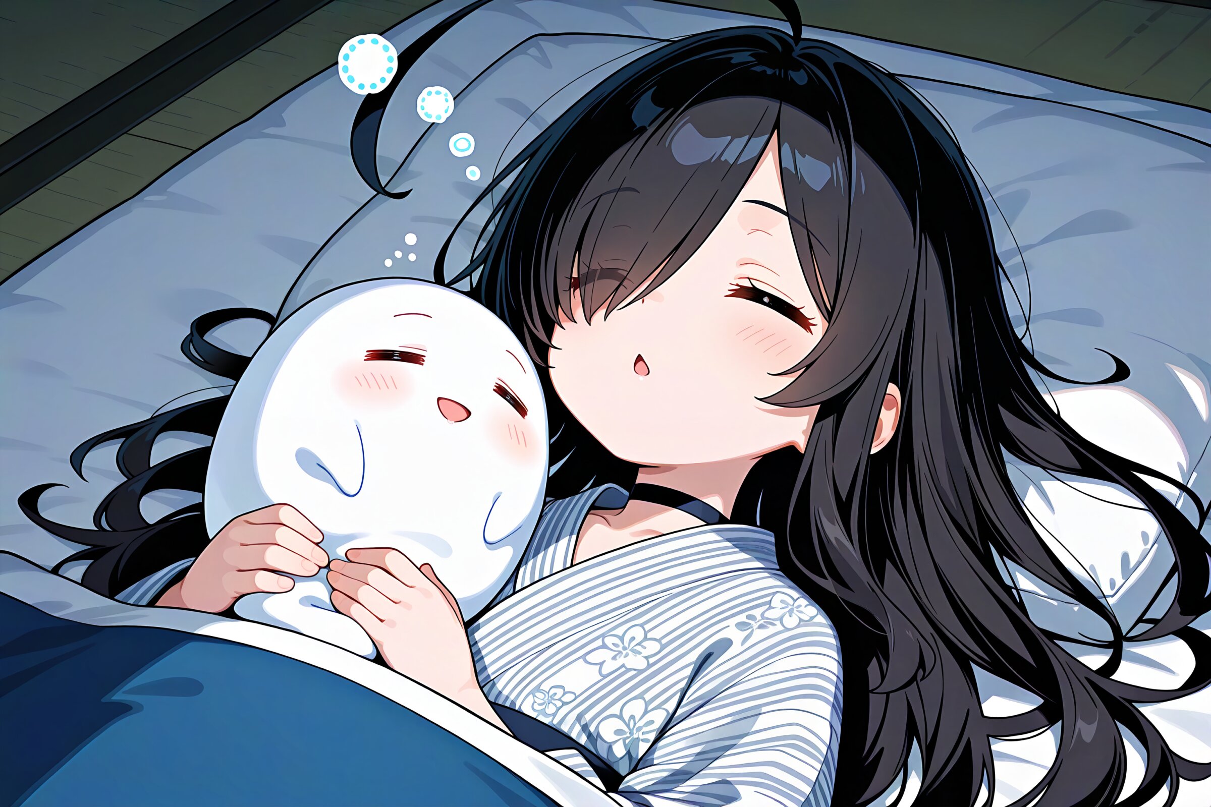1 little girl, solo, upper body, diagonal angle, masterpiece, best quality, amazing quality, very aesthetic, black hair, long hair, ahoge, (hair over one eye:1.2), closed eyes, =_=, chestnut mouth, smile, mouth, cheerful, relaxing, Squeans, spoken Squeans, choker, yukata, lying, sleeping, holding ghost, =_=, futon, morning,