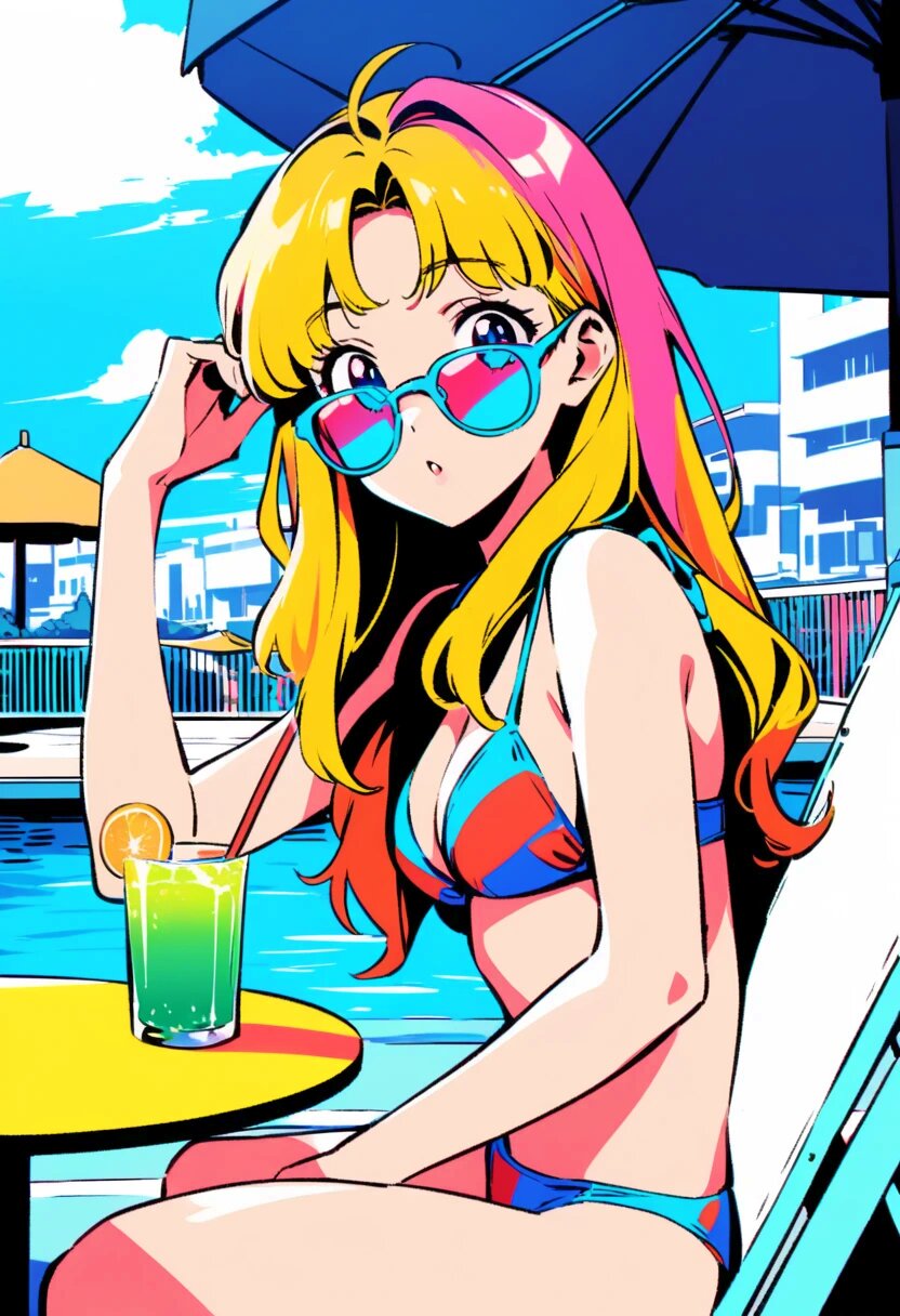 新しい水着と、特にお気に入りのこのカラフルなサングラスで、夏のオシャレは完璧!このグリーンのドリンクも、すっごくクールで美味しいの。