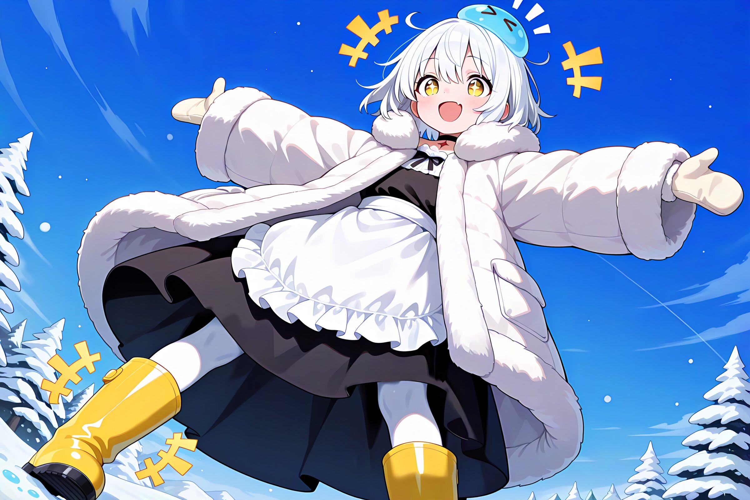 1 little girl, solo, from below, masterpiece, best quality, amazing quality, very aesthetic, white hair, short hair, yellow eyes, +_+, open mouth, smile, cheerful, +++, notice lines, choker, maid outfit, long fur coat, long skirt, rubber boots, mittens, thighhighs, standing, standing, legs apart, spread arms, slime on her head, > <, sparkling aura, sparkling boots, shiny boots, winter, morning,