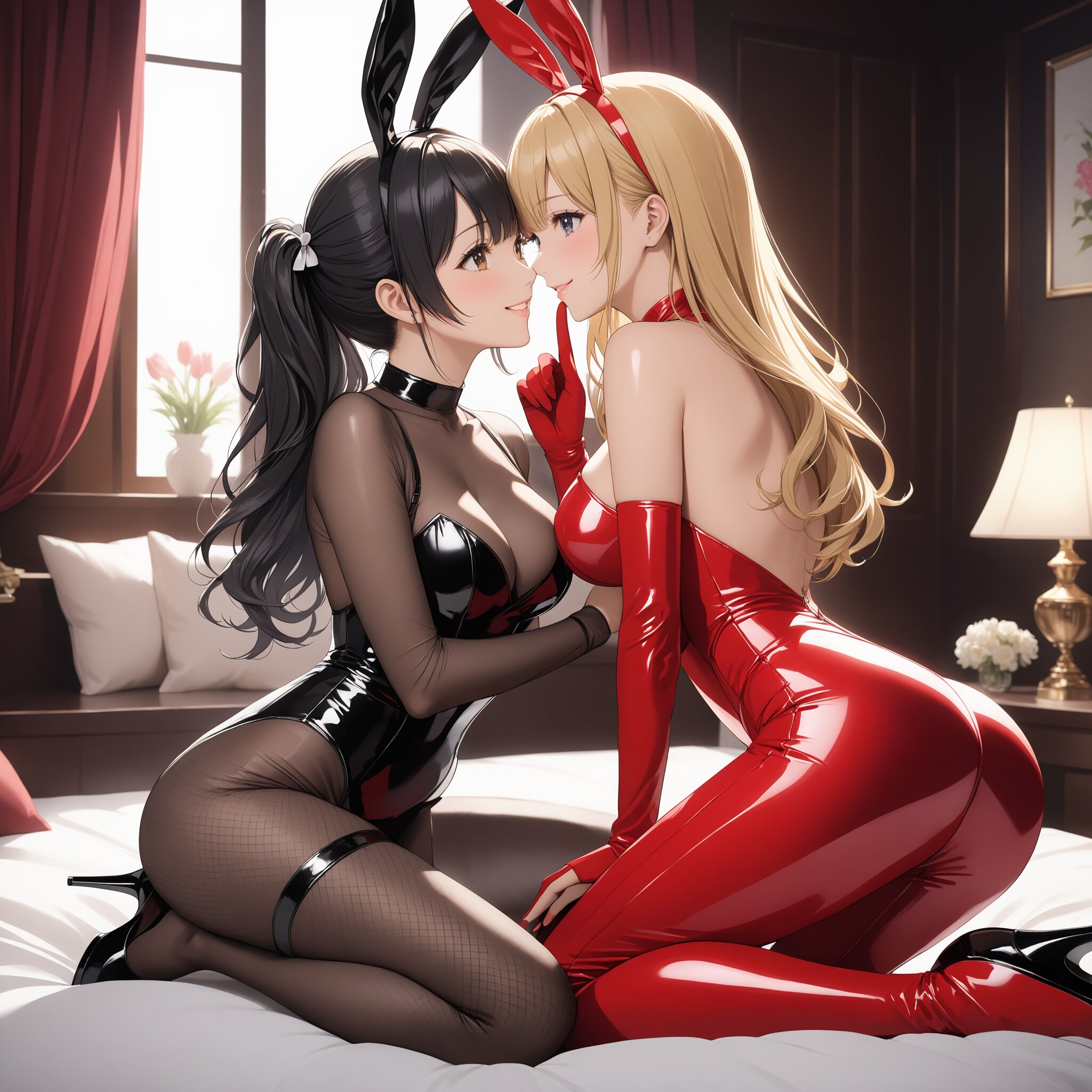 masterpiece, best quality, photorealistic, sharp focus, cinematic lighting, depth of field, beautiful composition, vibrant colors, ultra high res, 8K, highly detailed, masterpiece, best quality, very detailed, lora:Chisato&Takina_Illustrious-000056:1, Takina INOUE, black hair, bunny girl outfit, black bunny suit, bunny ears, fishnets, high heels, smile, closed mouth, Chisato NISHIKIGI, blonde hair, bunny girl outfit, red bunny suit, bunny ears, fishnets, high heels, indoors, looking at viewer, 2girls, whispering in ear, hand on cheek, gentle touch, shared laugh, romantic gaze, subtle tease, warm lighting, luxurious environment, flirty interaction