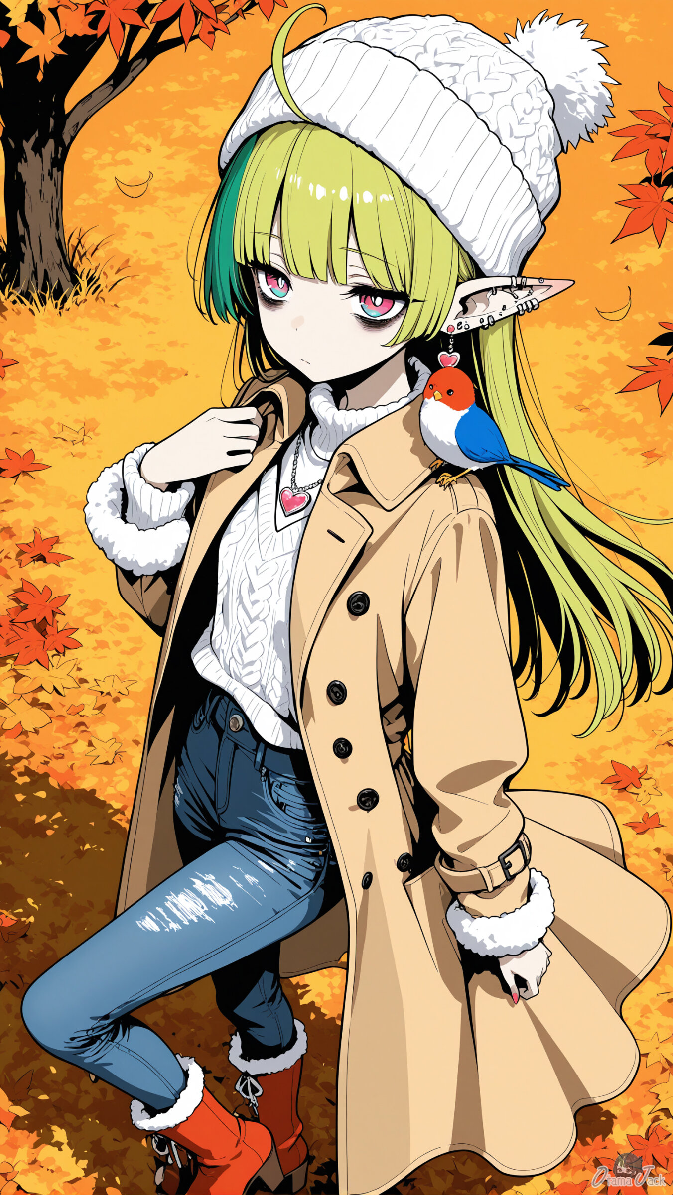 帽子とニットとコートとブーツで暖かそうな中でのダメージジーンズのデニム、これぞ自分が開催前に想像していたイメージのイラストです!