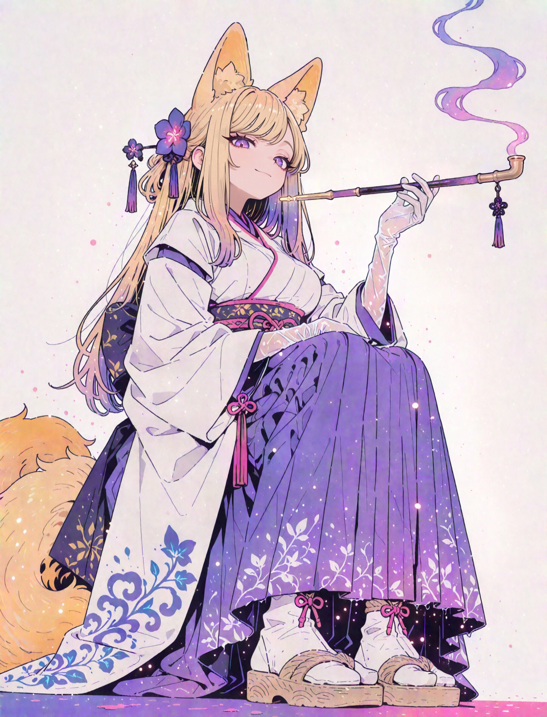 front view, low angle shot, looking down, (close up:1.2), (fisheye lens angle:1.0), looking at viewer, (simple white background:1.1), drop shadow, colored shadow, The background is a solid, bright vanilla, creating a striking contrast with the intricate, multi-colored design of the character, ink wash effect, pop color background, (high saturation:1.2), summer coloring, 1girl, fox girl, gold Blond Hair, large breasts and fox ears, (swept bangs:1.2), (perfect purple eyes:1.3) long eyelashes aristocratic features tall girl has (Blond Hair long hair over ears:1.3) fox 9tails, (wearing White Japanese Cloth straw sandal precise silk gloves long skirt Obi boots:1.3), hair ornament flower, tabi, detached sleeves, mysterious atmosphere, seductive smile, doyagao, holding smoke pipe light smoke breath, pink theme, super fine concept art, 8K, graceful eyes, masterpiece, best quality, amazing quality, very aesthetic, absurdres, newest, professional art lots of details, , overexposure, sumie effect style, 4ur4_illu,shiny, glowing, glowing particles, glowing light particles, light particles, icicle, <lora:noline (1):-0.5> <lora:sdxl2-flat2-512b:0.0> <lora:facelightup_xl_v10:0.5> <lora:V2_yakumo_alchemy:0.5> <lora:Aura_illu:0.1>