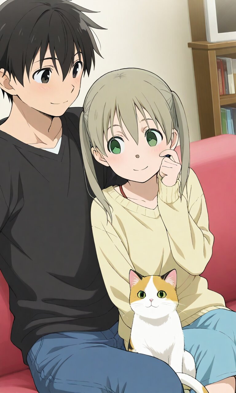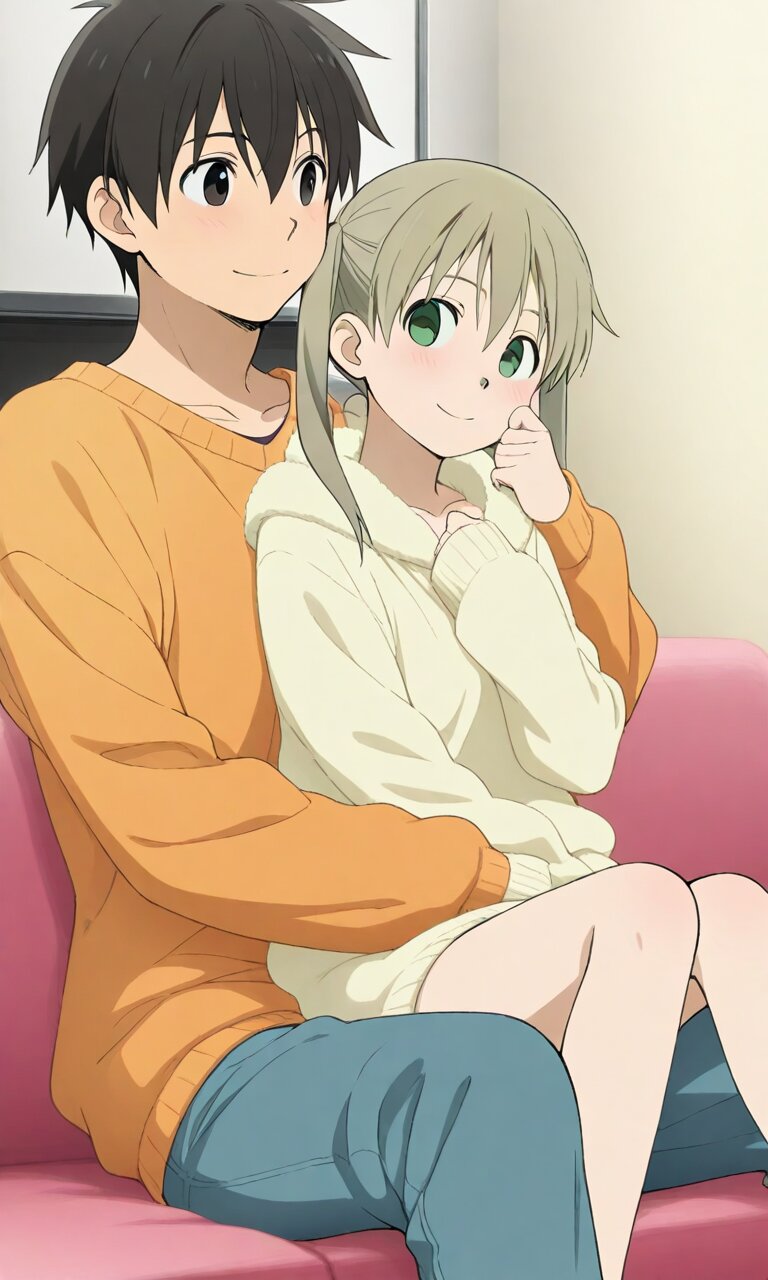 Couple, boy and girl, two people only,absurdres, ultra-detailed, master piece, high resolution, 8k, Boy, girl, couple,masterpiece, best quality, extremely detailed, beautiful detailed woman, playful cat-like smile, wearing oversized sweater, curled up on boyfriend’s lap like a cat, rubbing cheek against his chest, cozy living room with warm lighting, perfect anatomy BREAK the boy(original boy,black eyes, black short hair) BREAK the girl(maka albarn, blonde hair, twintails, green eyes, bangs, anime screencap ),