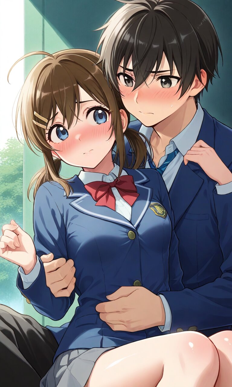 Couple, boy and girl, two people only,absurdres, ultra-detailed, master piece, high resolution, 8k, Boy, girl, couple, NSFW, masterpiece, best quality, extremely detailed, beautiful detailed girl, long brown hair in ponytail, blushing startled expression, shiny skin, wearing school uniform, boyfriend hugging her tightly from behind in dim alley at dusk, streetlamp glow, perfect anatomy BREAK the boy(original boy,black hair,short hair, black eyes) BREAK the girl(,aaizumi, brown hair, low twintails, ahoge, hair ornament, hairclip, blue eyes, small breasts,)), ,