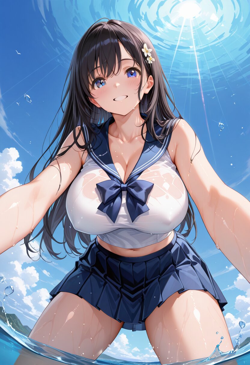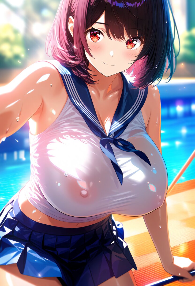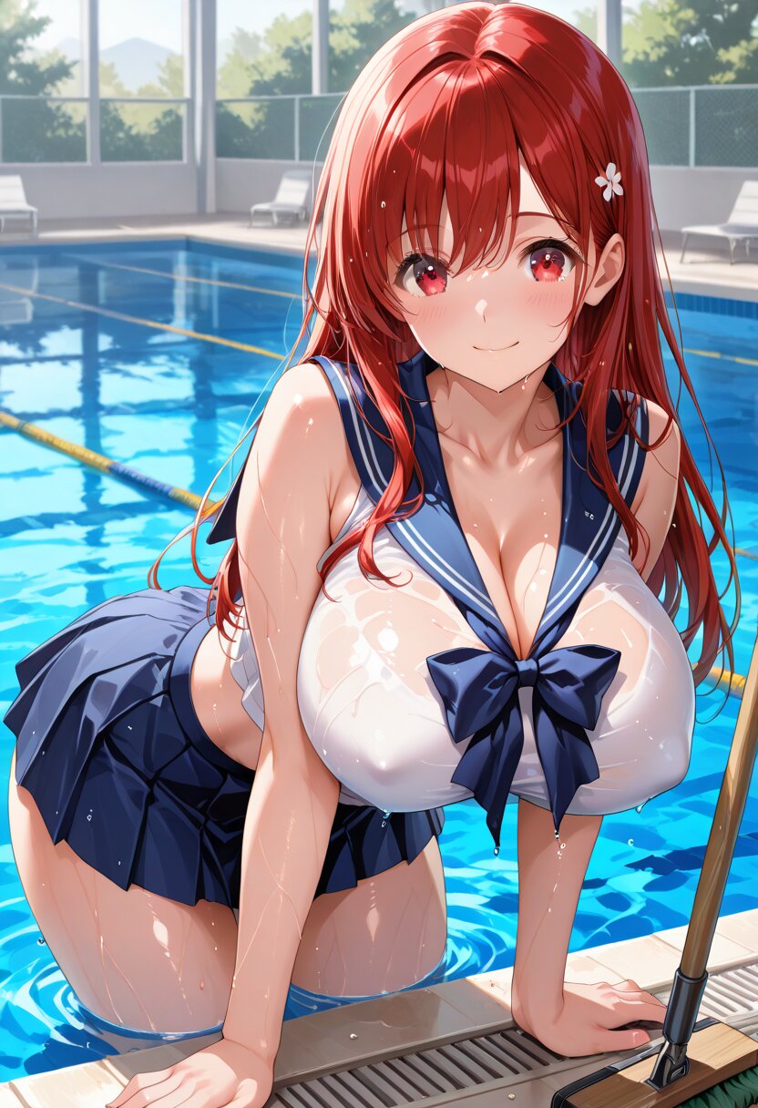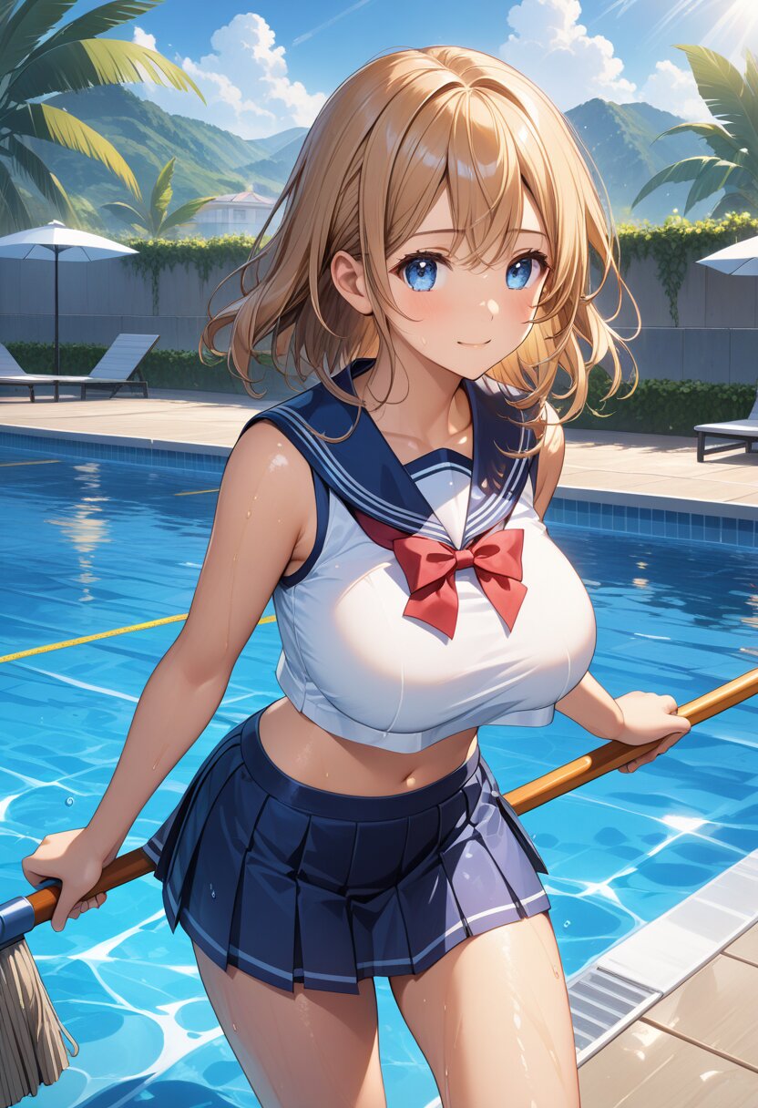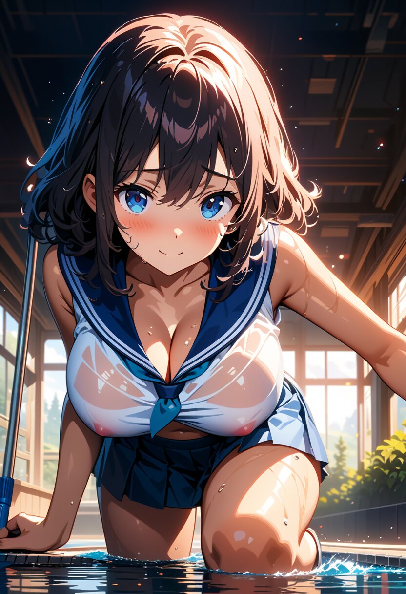 (masterpiece,high resolusion,illustration,ultra detailed 8k art,extremely detailed CG,official art,clothes reflecting light,detailed shiny skin,detailed background:1.3), ((highly detailed beautiful face and eyes)), 1girl,beautiful hair, beautiful eyes, looking at viewer, sailor school uniform, miniskirt, sleeveless, cleavage between sailor collar, midriff peek, huge breasts, impossible clothes, erect nipples, wet clothes, happy, school poolside, summer, Cleaning the floor with a mop, dynamic action,