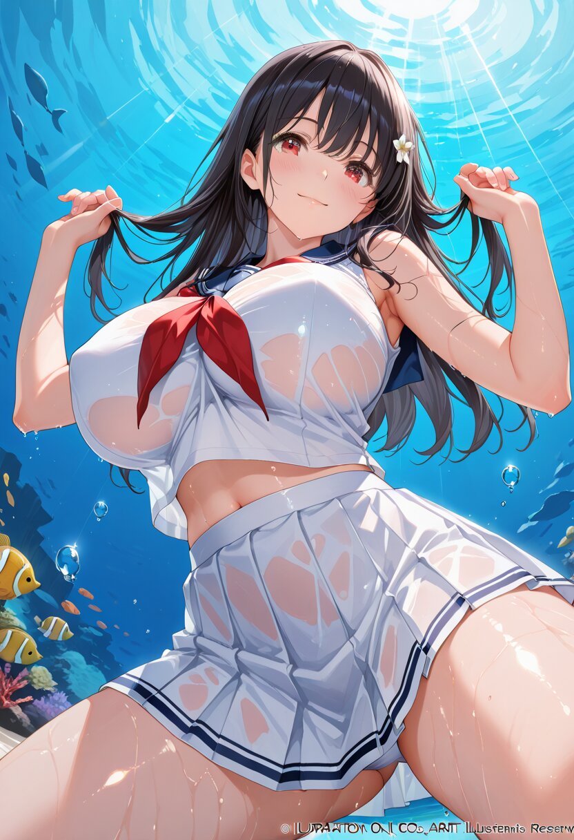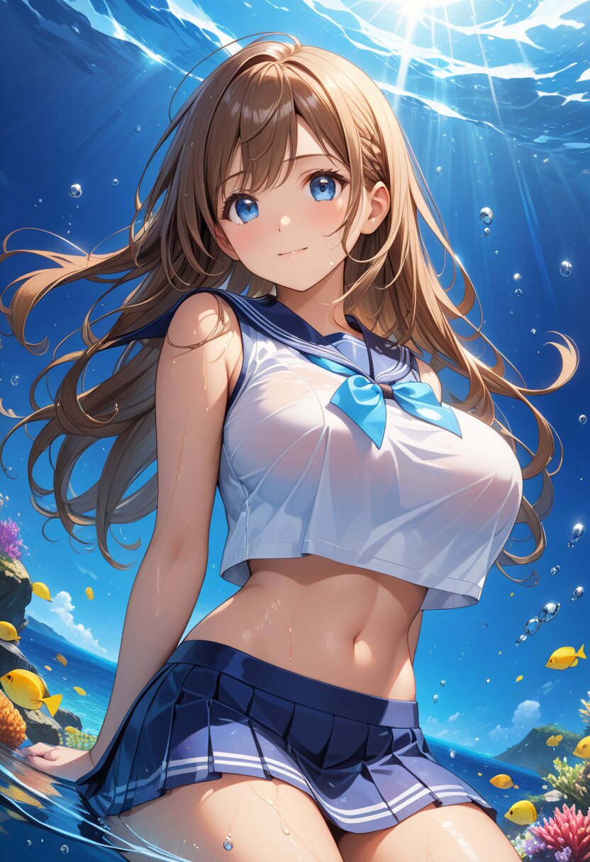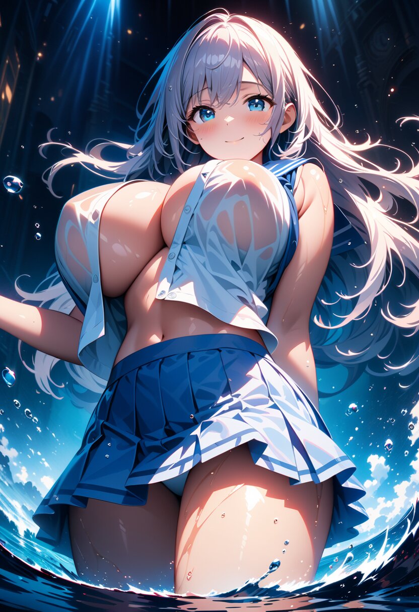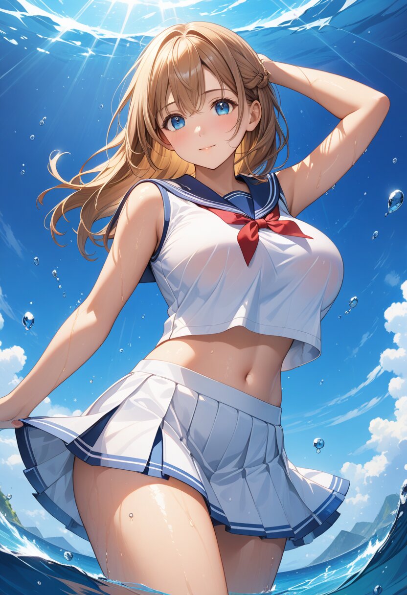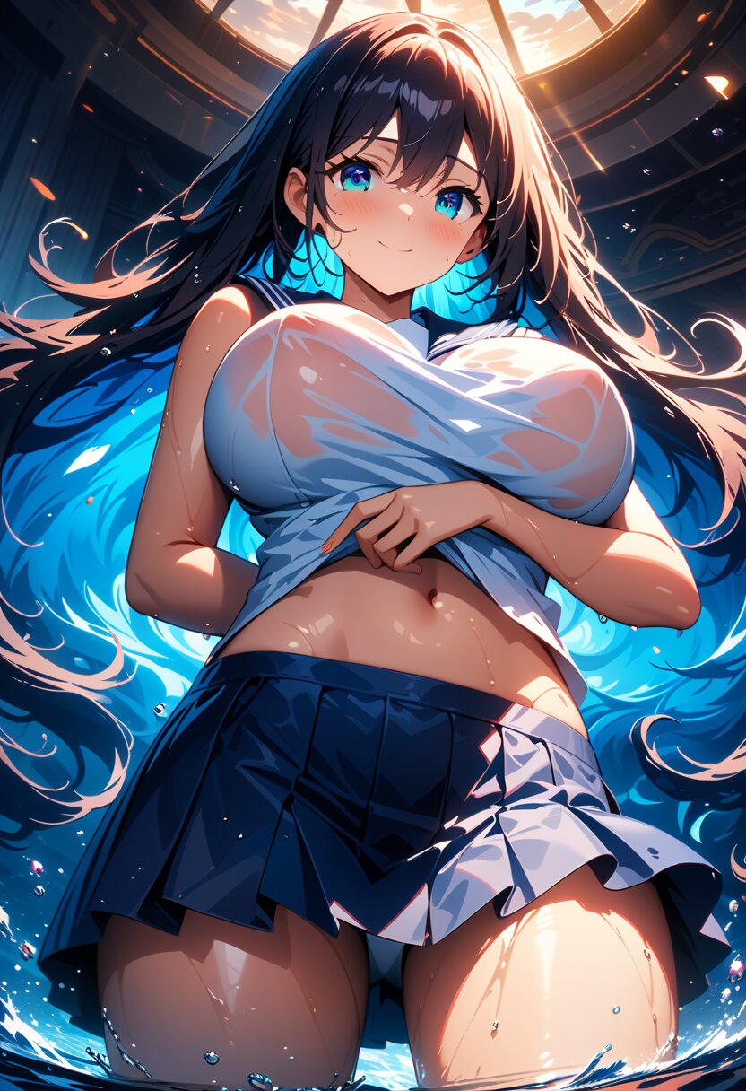 (masterpiece,high resolusion,illustration,ultra detailed 8k art,extremely detailed CG,official art,clothes reflecting light,detailed shiny skin,detailed background:1.3), ((highly detailed beautiful face and eyes)), 1girl,beautiful hair, beautiful eyes, looking at viewer, sailor school uniform, miniskirt, sleeveless, cleavage between sailor collar, midriff peek, huge breasts, impossible clothes, erect nipples, wet clothes, happy, school poolside, summer, Cleaning the floor with a mop, dynamic action,