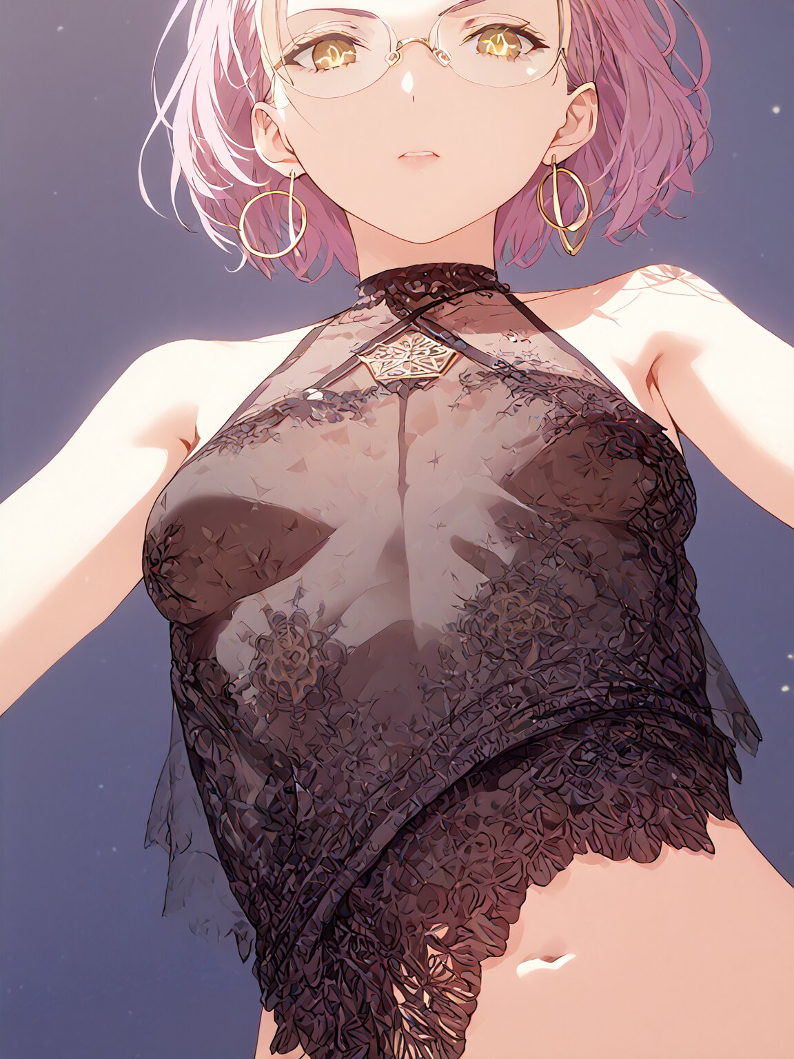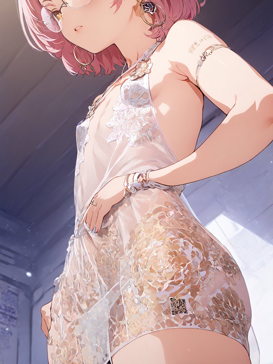(extremely detailed CG unity 8k wallpaper:1.2100000000000002), (delicate facial features:1.2100000000000002), (ultra high res:1.2100000000000002), (extremely detailed eyes and face:1.2100000000000002), (perfect anatomy:1.2:1.2100000000000002), (super detailed skin:1.2100000000000002), (super fine illustration:1.2100000000000002), white halter neck collared sleeveless back open shirt, Expressiveh, s1 dram, g4n1m3, jsyu style, IIIIIIIIIIIIIIIIIIIIIIIIIIIIIIIIIIIIIIII, mole, mole under eye, ring, thighhighs, gold embroidery, very short light pink hair, forehead, yellow eyes, slicked-back hair, combed-back hair, circle-glasses, round eyewear, barcode on arms, QR code on legs, text on anywhere, see-through silhouette, (mtu virus:1.2100000000000002), (multiple angles:1.2100000000000002), (from below:1.2100000000000002), hoop earrings. 1girl, jewelry, earrings, hoop earrings, Perfect hand, Detailed hand, eyeshd kk sexybody 01, as if they are in a state of deep thought or contemplation., score_9, score_8_up, score_7_up, source_anime, highres <lora:light_see:0.67> <lora:mtu_virusPony:1> <lora:CMN(Pony)0.1v:0.65> <lora:Hoop_earrings:0.66> <lora:suzukikyoutaroubody:0.72> <lora:Better hands - SDXL v2.0:0.8> <lora:Eyes_High_Definition-000007:0.64> <lora:kk_sexybody_01:0.65>