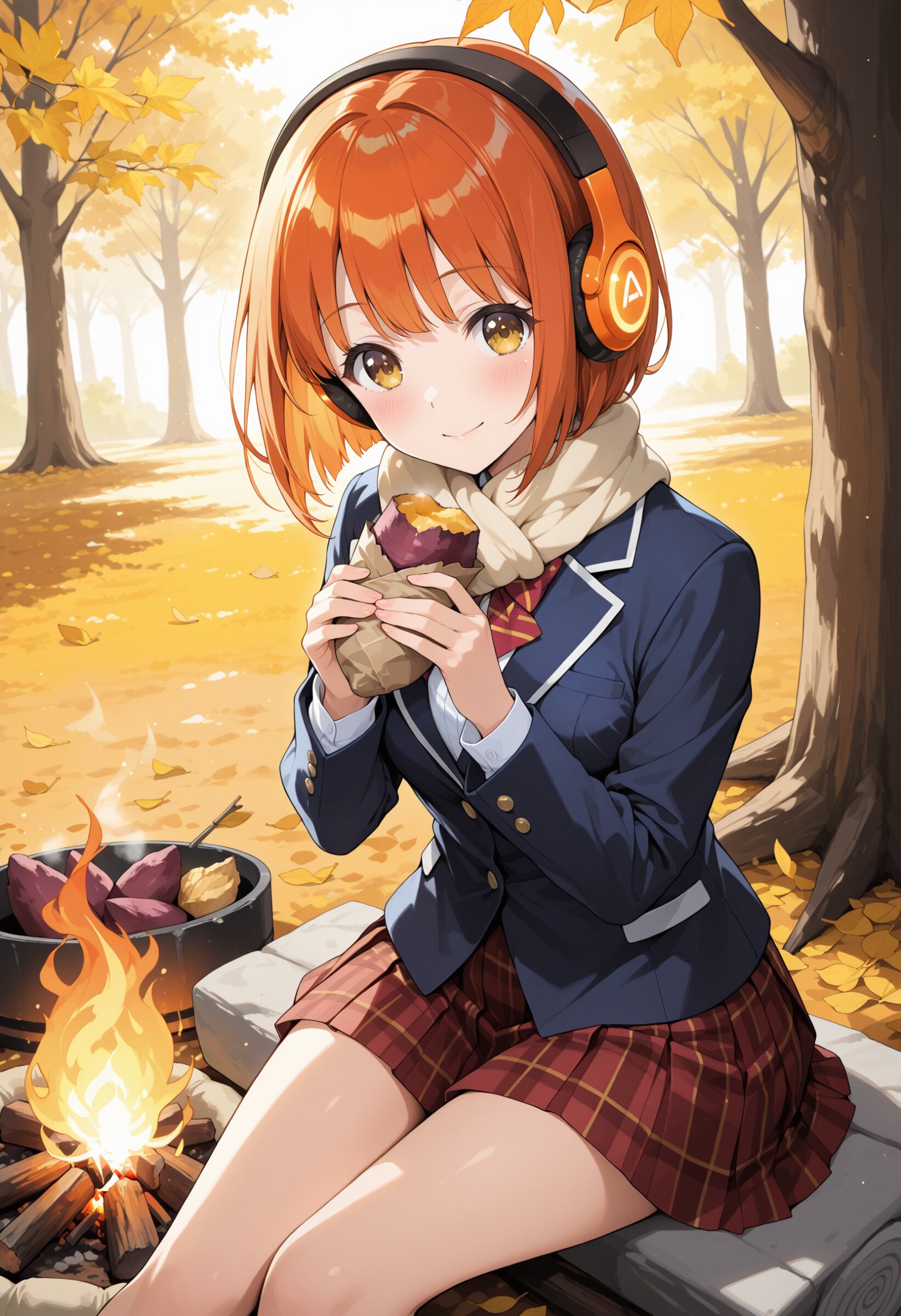 Zena, a Japanese idol with bright orange bob hair and orange headphones, wearing a brown and red tartan-check school uniform with a pleated mini skirt and long-sleeve blazer. A warm beige muffler is wrapped loosely around her neck. She sits by a campfire surrounded by fallen red and yellow leaves, holding a baked sweet potato wrapped in foil. Her shoulders have a small slit detail, glowing softly under the firelight. A professional photographer captures the scene with cinematic lighting — amber fire reflection, golden autumn tones, shallow depth of field, and a dreamy soft focus.