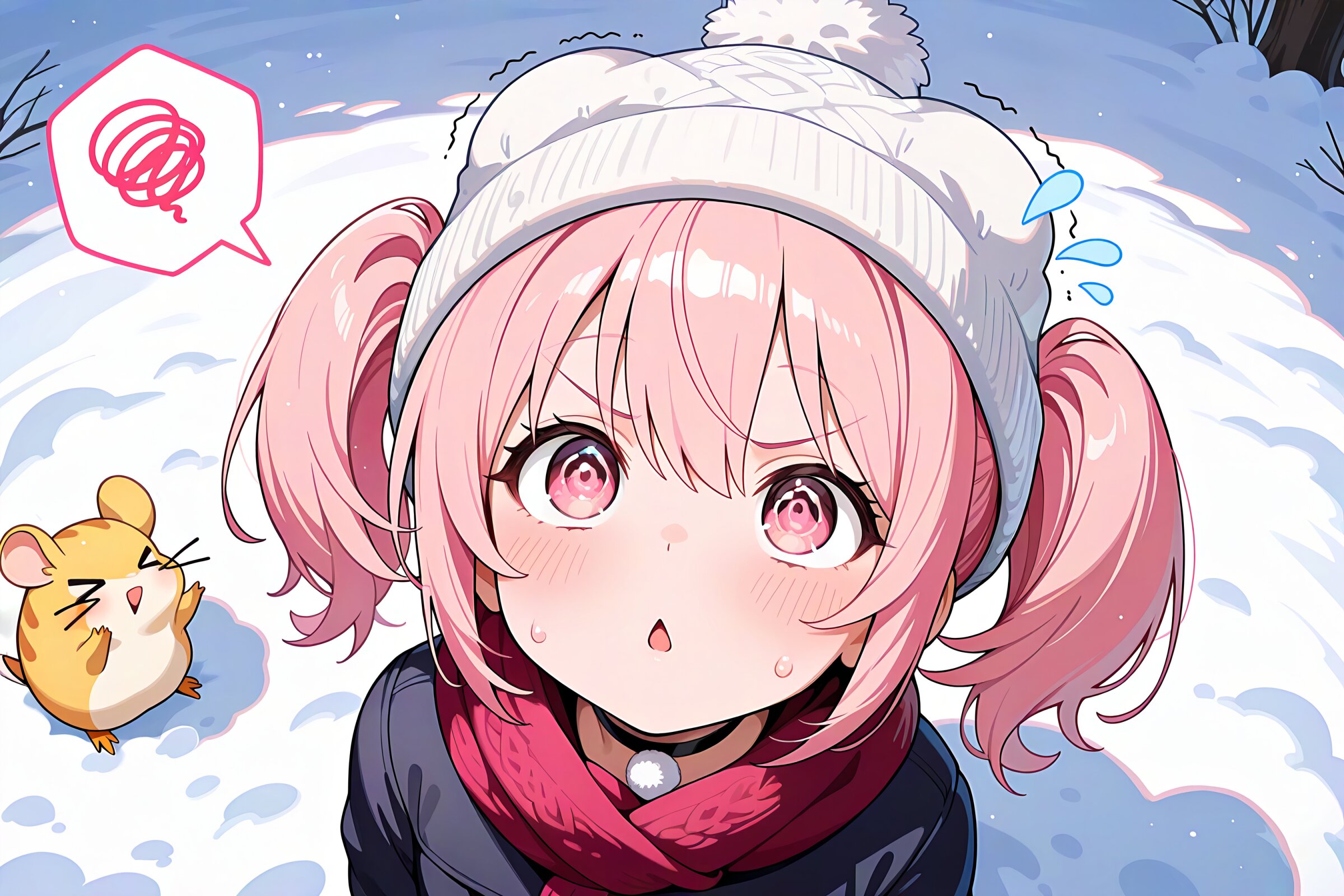 1 little girl, solo, diagonal angle, upper body, from above, masterpiece, best quality, amazing quality, very aesthetic, pink hair, twintails, pink eyes, , chestnut mouth, confused, troubled, angry, sweat, flying sweatdrops, shout lines, spoken squiggle, shout lines, choker, winter outfit, scarf, winter hat, looking up, winter hat, knit cap, pom pom hat, bulging hat,wiggling, trembling, hamsters, > <, winter, snow, morning,