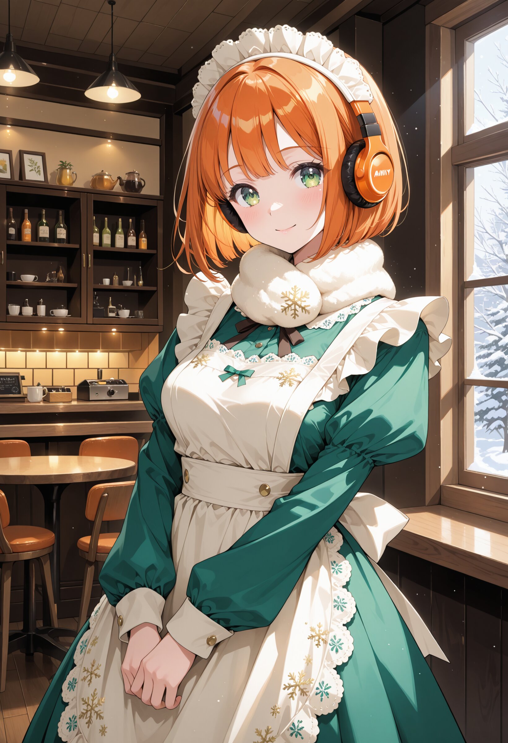 Zena, a Japanese idol model with bright orange bob hair and orange headphones, wearing a mint-green maid dress with white lace apron, long puff sleeves, and a subtle shoulder slit. A soft white wool muffler is wrapped loosely around her neck, snowflake embroidery glimmering under soft lighting. She stands in a Scandinavian-style caf� with frosted windows and pale wooden furniture, photographed by a professional fashion photographer using airy natural light and pastel tones for a dreamy winter mood.