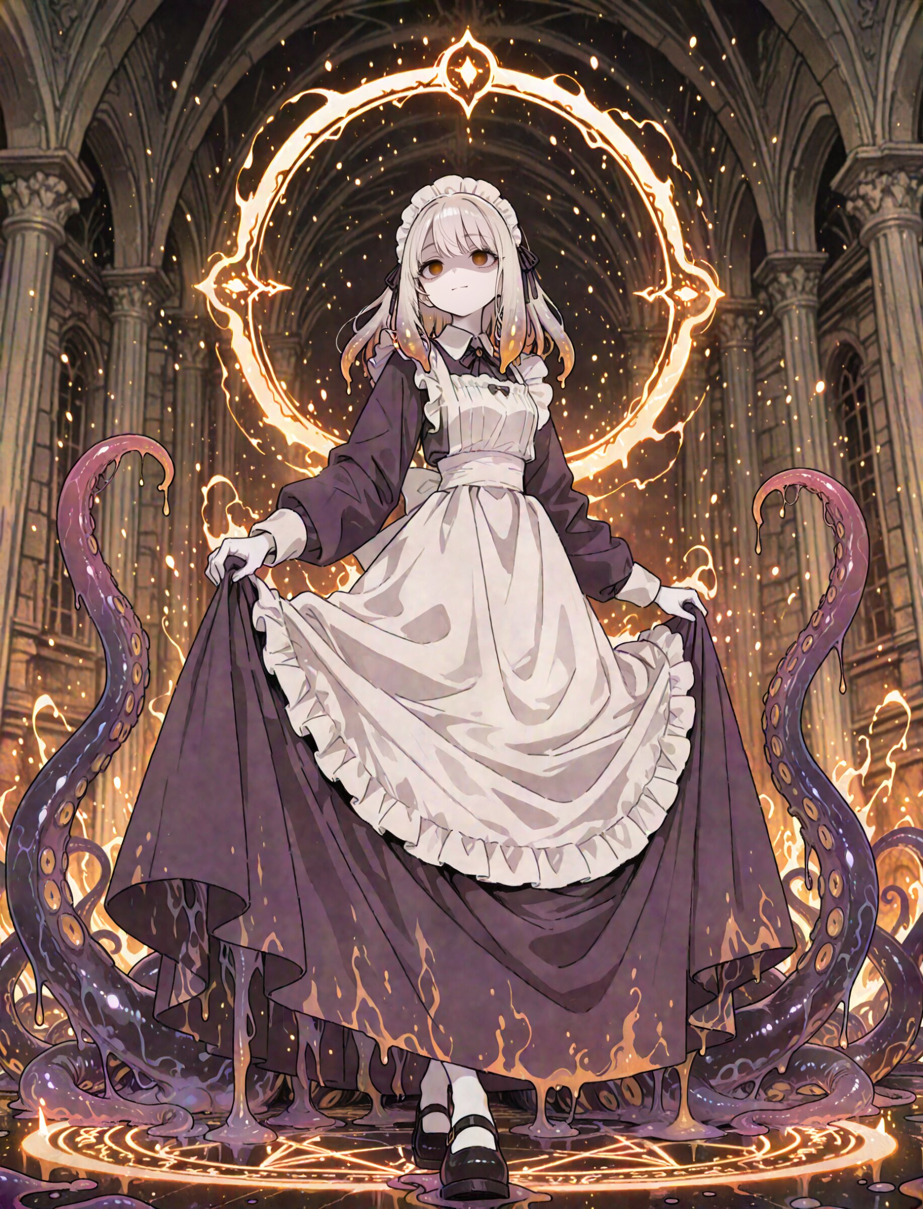 foreshortening, (face:1.2) looking ahead, (dutch angle:1.2) autumn atmosphere, earthy color, melting, water drop , 1girl, (ultra-detailed), solo, maid, pale skin, pale burgundy hair, (beautiful empty eyes, light smile, shaded face:1.0), long sleeves classic maid uniform, long skirt, maid headdress, maid apron, luminous effect lens flare lotion shiny-glistening cute girl solo full body, standing, crossed legs, skirt lift, graceful courtesy, bowing (burgundy tentacle hair, tentacles aura, huge tentacles from magic circle, horizontal pupils:1.1), super fine concept art, 8K, graceful eyes, masterpiece, best quality, amazing quality, very aesthetic, absurdres, newest, professional art lots of details, , overexposure, sumie effect style, 4ur4_illu,shiny, glowing, glowing particles, glowing light particles, light particles, blast, <lora:noline (1):-0.5> <lora:sdxl2-flat2-512b:0.0> <lora:facelightup_xl_v10:0.5> <lora:V2_yakumo_alchemy:0.5> <lora:Aura_illu:0.1>