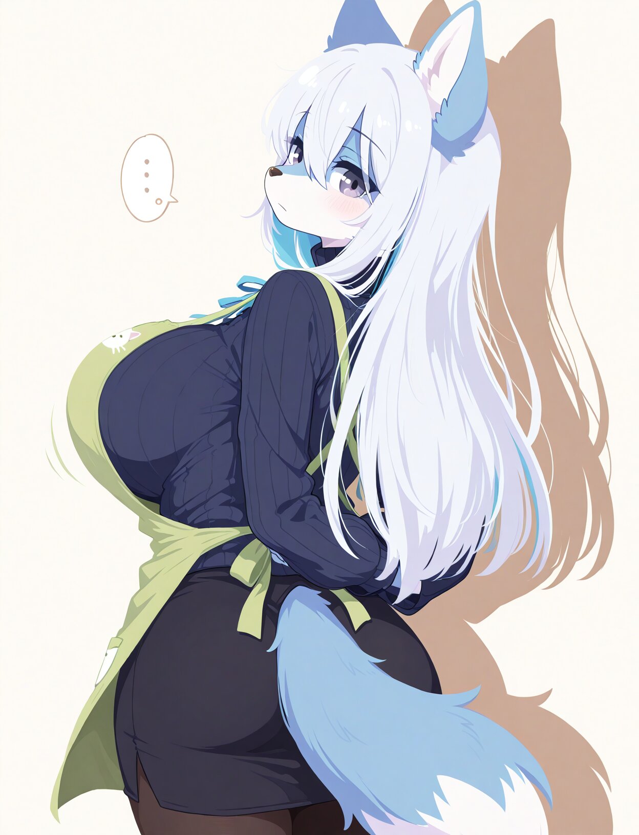 1girl, (wolf girl), (furry female), (snout:1.3), blue fur, wolf ears, ears up, wolf tail, fluffy fur, body fur, (gigantic breasts), narrow waist, silver hair, hime-cut, long hair, colored inner hair, hair over eyes, hair between eyes, silver eyes, long bangs, revealing clothes, undersized clothes, high collar, black collar, blue neck ribbon with loose ends, revealing clothes, undersized clothes, layering, separated turtleneck and apron, green apron, cat print apron, black turtleneck, ribbed turtleneck, long sleeves, black skirt, pencil skirt, black pantyhose, expressionless, unemotional, motion lines, motion blur, motion trail, afterimage, perspective, arms behind back, spoken ellipsis, white outlines, drop shadow, white background, simple background, looking back, face focus, breast focus, close-up, from behind, ((low contrast)), (digital art:1.1), (anime coloring), (kawaii), softy, (2D), (cute), furry, (two tone fur), (furry body), perfect body, detailed face, high quality, cute clothes, animal tail, animal ears, solo, masterpiece, ((correct_anatomy)), pretty and cute, comical, simple, anime, anime style, smooth lineart, clean and smooth lineart, thin and precise outlines, soft shading, vibrant colors, thin lineart, beautiful lineart, beautiful eyelashes, Bright colors, Contour line, pale painting, (detailed_hands:1.5), flat color, no lineart, close-up, eye focus, close-up, furry, (two tone fur), (furry body), perfect body, detailed face, high quality, cute clothes, animal tail, animal ears, solo, masterpiece, Bright colors, Contour line, pale painting, (detailed_hands:1.5), flat color, no lineart, close-up, eye focus